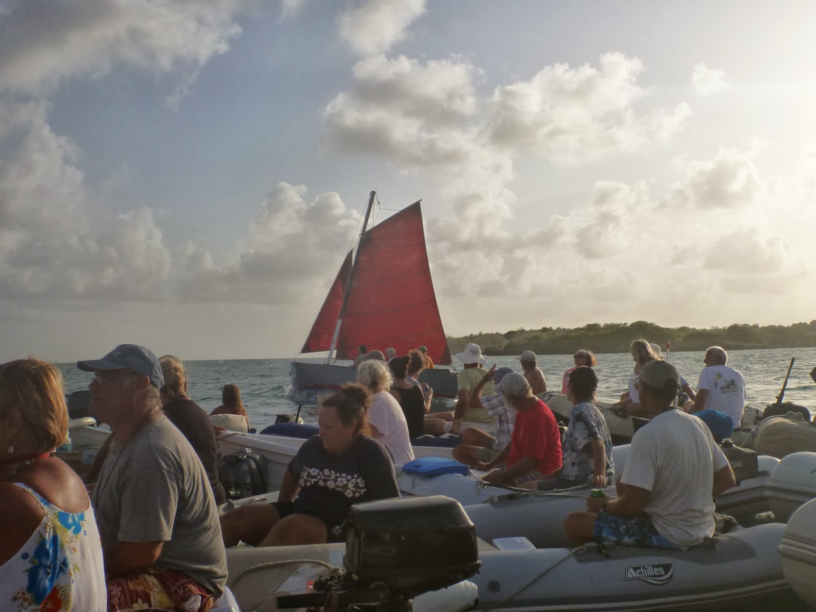By the time the band struck up their first notes there were around thirty or forty yacht tenders tied to the barge, pontoon or to each other. Water taxis delivered yet more of the audience and then the Rum Runner, a two storied steel catamaran, like a river fun boat turned up bringing another bar and a couple of hundred more people to swell the audience. A local sailing work boat with lateen rigged tan sails worked it’s way to windward then rounded up to come alongside the bar on the steel barge, it’s lady skipper danced her way through the concert in its foredeck.