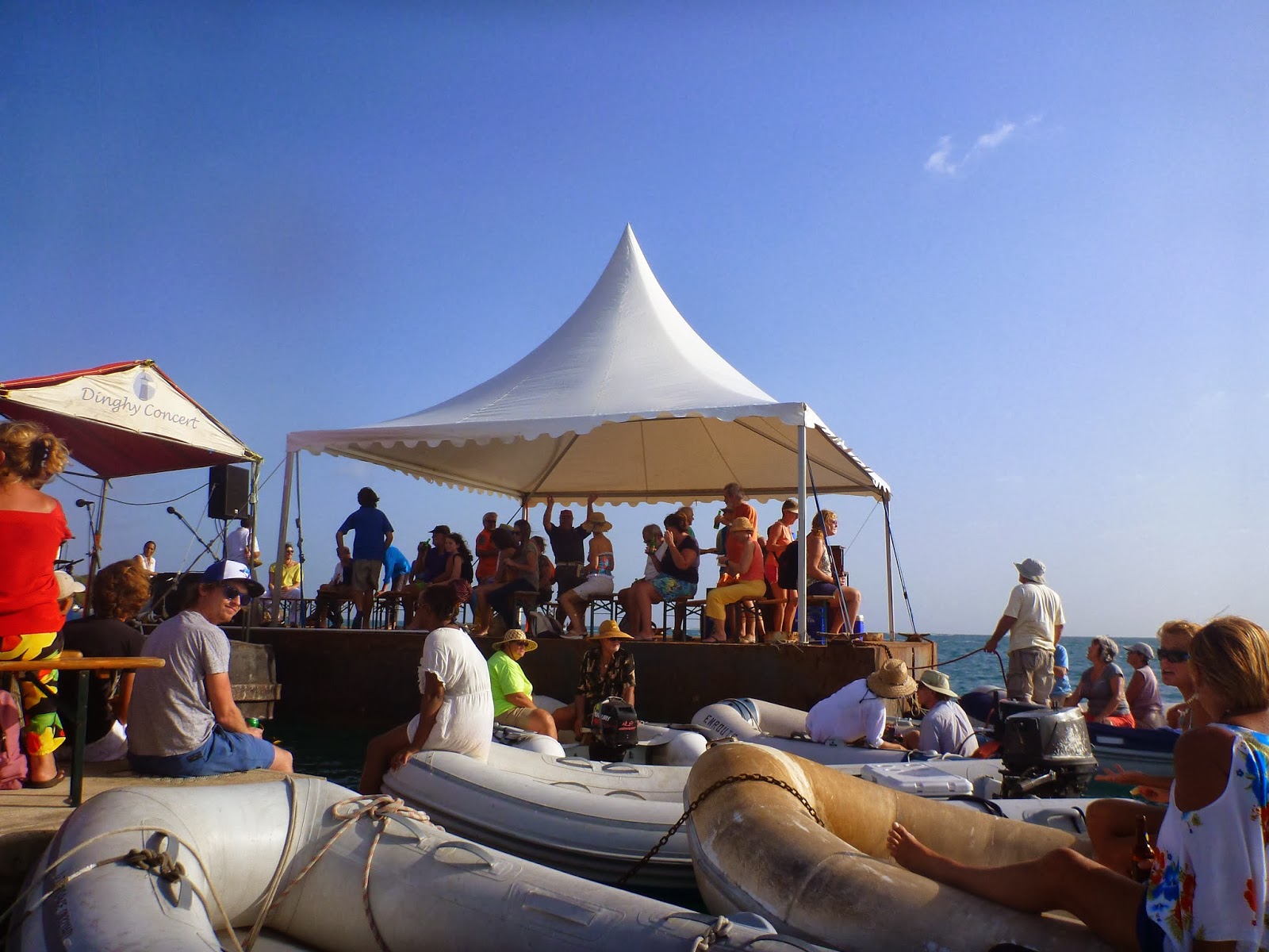 Take one large steel work barge, one length of concrete pontoon and a small tug; add a bar under a marquee roof on the barge and a band under a bimini on the aft deck of the tug plus some sizeable speakers, some bench seating and a large number of sailors and you have a unique concert in the bay. The three of us like everyone else arrived by boat at the floating concert venue moored in the middle of Clarke Court Bay, Woburn, Grenada on Wednesday afternoon. And like many people we came armed with vouchers for a free beer courtesy of Island World chandlery where we had been shopping for boat bits a few days previous.