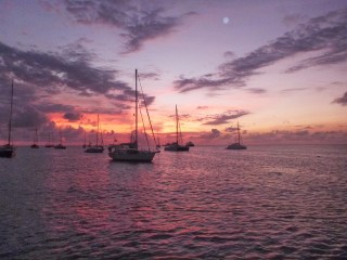 So here we are back on the boat, Kevin turned some of our surplus of Spanish onions left over from our Transatlantic into a surplus of French Onion soup a la Delia (Smith, one of our two big cookbooks on board, the other being the delightful Nigel Slater). It was his first attempt at traditional French cuisine and made an excellent late lunch. This evening we’ve been invited to join a cruiser drinks and supper event but as the crew of Blue Zulu Steve and Mags, who invited us, only knew the time to rendezvous (5pm at the Lambi Queen Restaurant jetty) we are in the dark as to what and where. Plenty of time before then for a swim and a shower, we are getting into the Caribbean lifestyle – everything shuts at lunchtime on Saturday and doesn’t re-open until Monday morning so the cruisers just hang out (lime) once the Saturday shopping is finished.
