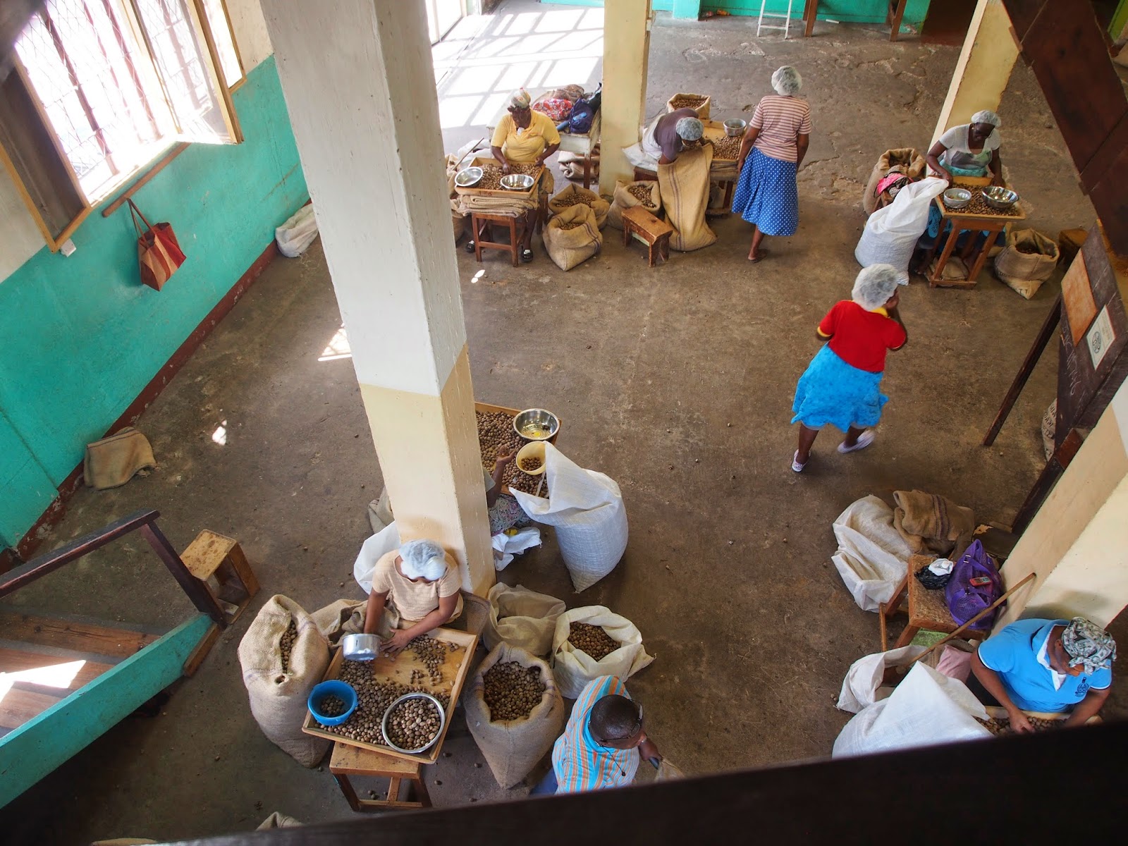So what did we learn – most of today’s locals are descended from slaves from the Ashanti tribe of West Africa brought by the French and later the English to work the plantations; bananas and sugar cane were imported and grow successfully to this day. Later in the 19th century nutmeg seedlings were brought from Indonesia to the island by an Englishman; Grenada is today the second largest producer of nutmegs in the world (Indonesia is the first). Many nutmeg trees were destroyed by hurricane Ivan in 2004 but the industry is recovering with new trees planted. It takes about 15 years for a nutmeg tree to produce fruit. The locals grow the trees in their gardens and farms and the nutmeg is collected and processed by an island wide co-operative at two of three stations around the island. Every part of the nutmeg is useful; the outer soft yellowy skin is pressed for juice, the inner red coating is dried to become mace and the nut is dried before shelling. The best quality nutmegs are shipped all over the world for food use, the rest are used for cosmetics and pharmaceuticals. Even the hard shell of the nut is not wasted, ground down to make a mulch to fertilise the soil and prevent weeds in local fields and gardens.