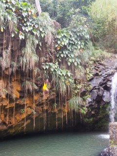 All in all a splendid day out with oil down for lunch (the national dish consisting of fried fish, chicken and lots of starchy root veg plus solid grey dumpling chunks in a sort of curried gravy, spicy and filling) in one of the north eastern villages. Towards late afternoon we visited one of the many waterfalls on the island, it was raining which was pleasant to stand about in after the earlier heat. None of us were equipped to swim but we did pay one of the local young jumpers to leap from the top into 50 feet into the pool below – what a way to earn a living!