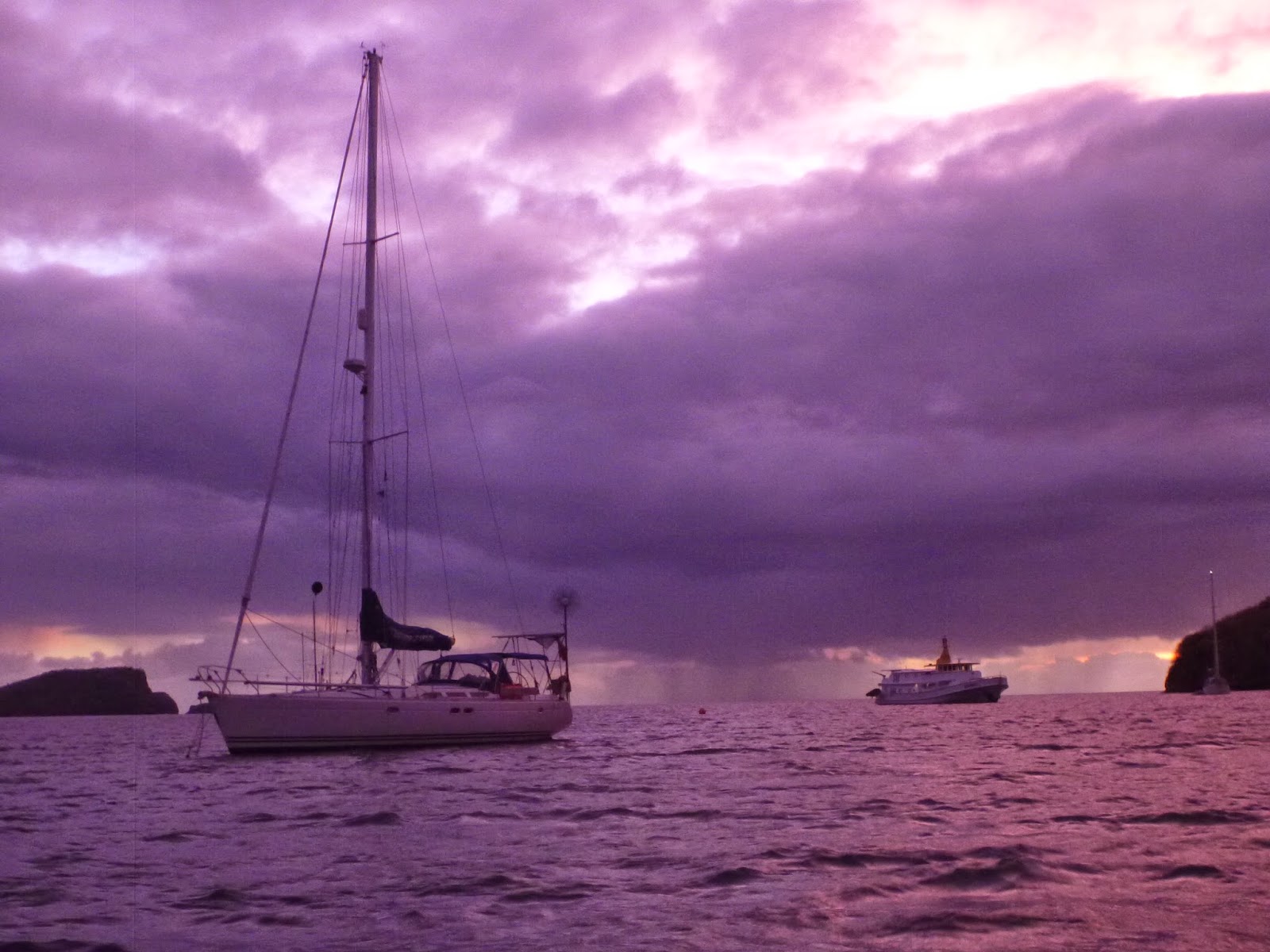 Kevin came to the rescue. He took off his cap, sunglasses and t-shirt, donned his snorkel and mask then stuck his head under water. After a few minutes tugging the anchor started to move. The Germans hauled up the mooring rope tangle a little more then tried to lower the anchor again and this time it swung free. They were very happy, we swapped introductions and left for our swim with a promise from our new friends that they would buy us a beer before they left. That evening we went out for supper at L’Auberge just across from the anchorage. The place was busy as Wednesday night is live music night – blues jazz and a few old favourites. Great food, friendly attentive staff plus an amazing view from their balcony across the bay made for a night to remember. Just as we were wondering whether to have a night cap here or back on Temptress one of the waitresses arrived bearing two brandy snifters of local aged rum, mindreader we thought. “A digestif from the table over there” she smiled. We looked up and there were the German crew waving at us. They too were just finishing their meal so we joined them for the rest of the evening and some more rum!