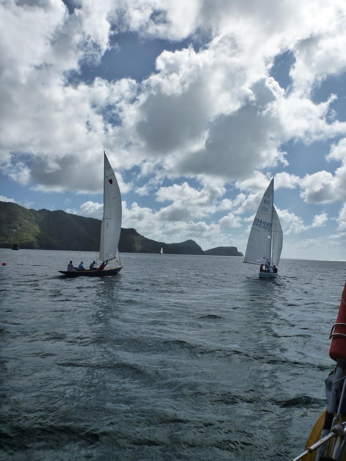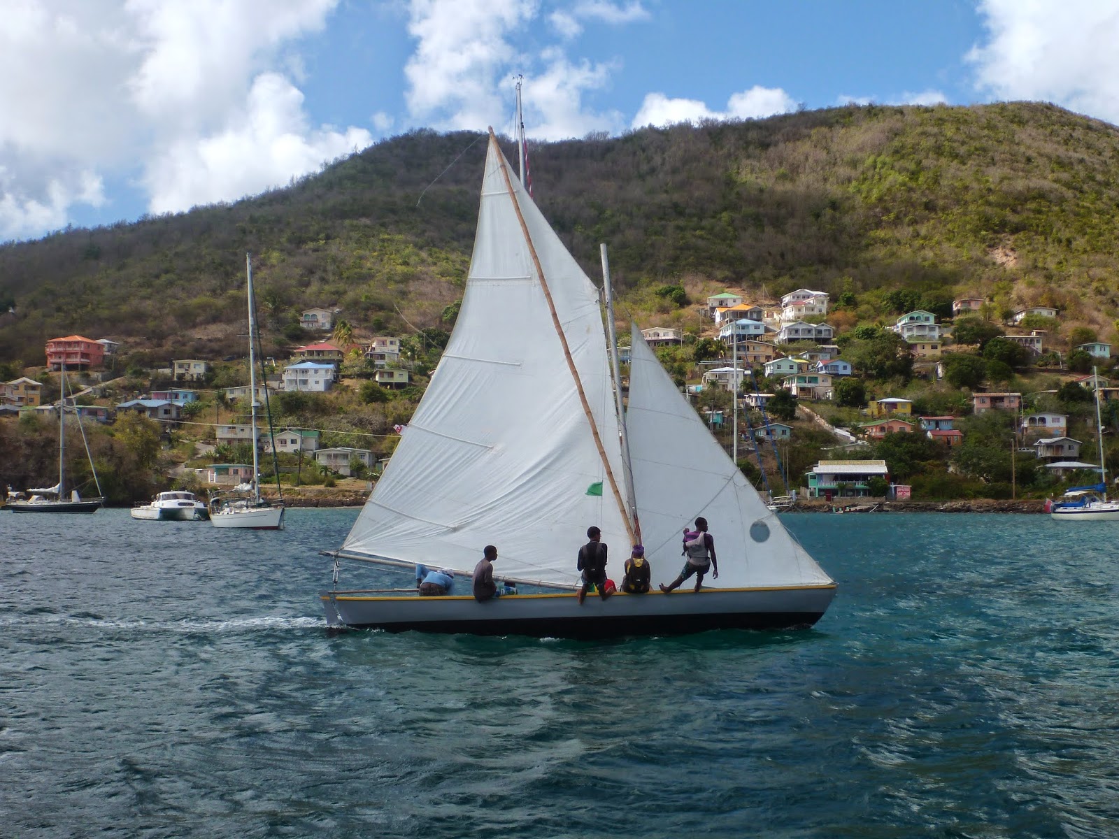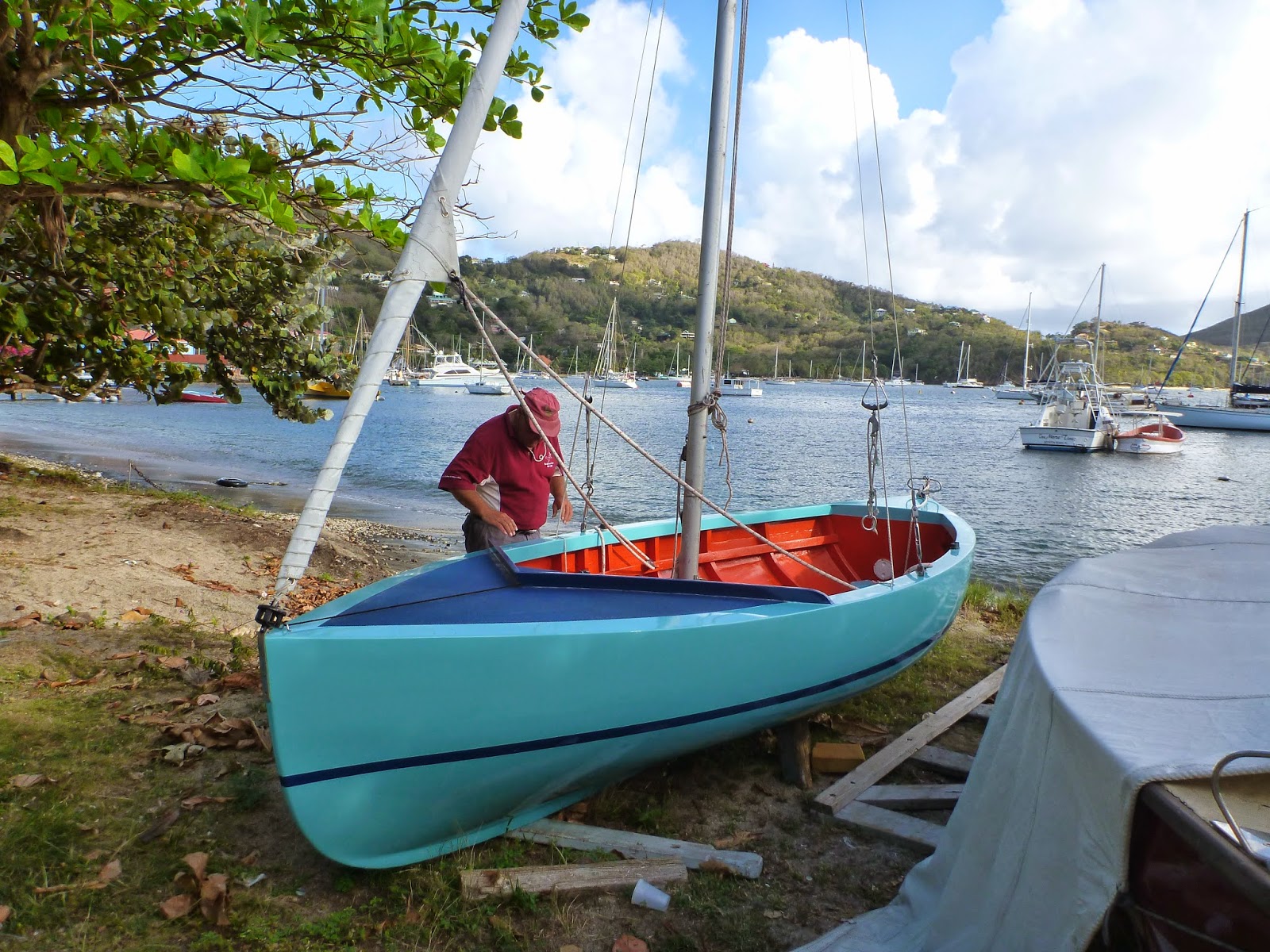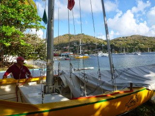 On the waterfront we stopped to admire the boats of the Bequia Youth Sailing (who needs a club house, just a strip of sand scattered with palm trees a tarpaulin for shade and a big banner). As well as a collection of donated opies for the younger members there are several double enders in various sizes up to about twenty feet, based on N American whaling boats for this island was once a whaling station. In fact Iron Duke is an original whaling boat from the 1870’s and everyone here is very proud that it still races! With fully battened well made gunter rigged sails and three or four trapezes the Bequian double enders seem an odd mix of old and new sailing technology. Fast and furious and unforgiving of any mistakes when sailing the local teenagers love them even when they turn turtle and are swamped – getting wet is not an issue when the water is warm and the sun hot. A couple of older locals are busily training up a new generation of sailors to ensure that Bequia’s boatbuilding and whaling past is not forgotten. Every day after school we see one or more boats out on the bay. The Bequia YC also has a fleet of double enders owned by its members plus an Etchell and what we think is a Sunbeam – the latter two are sailed most afternoons by youngsters racing each other out beyond Hamilton point and back.