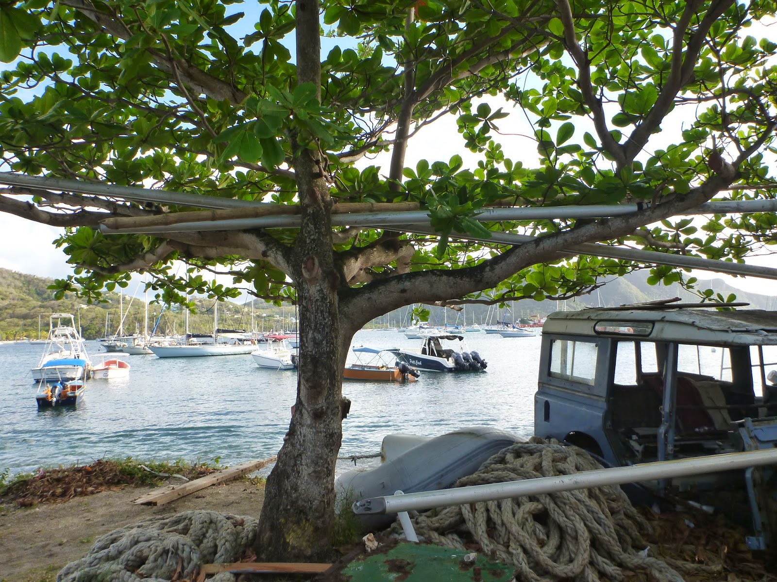 As the forecast was not particularly calm or dry we decided Tobago Cays could wait for better conditions and set sail on the last Friday in March for the beat north to Bequia (Beck-wah). After all cruising like this we have no holiday timetable with return flights booked in two weeks time as many sailing here have. With a month’s cruising permit for the whole SVG we can be patient and even apply for an extension if we need to. There is plenty else to do – museums, provisioning, hiking, boat fixing – that can be done despite squalls and tropical downpours. The whole thirty nautical miles was past islands on the starboard side (the east) – Canouan, Mustique and a host of smaller ones we found it hard to identify without having the chart on deck all the time. Squalls passed ahead of us and behind us, it got windy for a time but we barely got damp, enjoying the freedom of being at sea again for several hours.