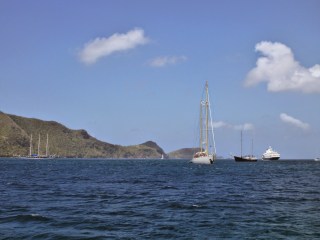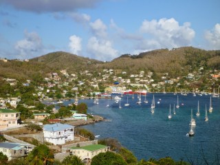 Admiralty Bay, Bequia is a huge space surrounded by steep tree clad hills and crowded with mooring buoys, charter boats at anchor plus a few cargo ships, local ferries and, when we arrived, Sea Cloud a lovely old windjammer now used as a small cruise ship. Port Elizabeth the only town on the island (think small village in European terms) has a few supermarkets and veg stalls (supermarkets only sell tinned and packaged foodstuff, alcohol, household items like loo paper plus catering quantities of paper plates or plastic cups and sometimes frozen chicken and pork). Temptress stocked up with a slab of local beer, two bottles of South African wine and two litres of UHT milk. The latter had been hard to find anywhere since we left St George. Liquid milk is more expensive than alcohol, it seems most locals prefer the powered variety as it keeps longer and occupies less space, crucial when everything has to be shipped in. Hence having a breakfast of cereal and milk has become a treat rather than the norm on board with our precious stock of UHT reserved for use in teas and coffee.