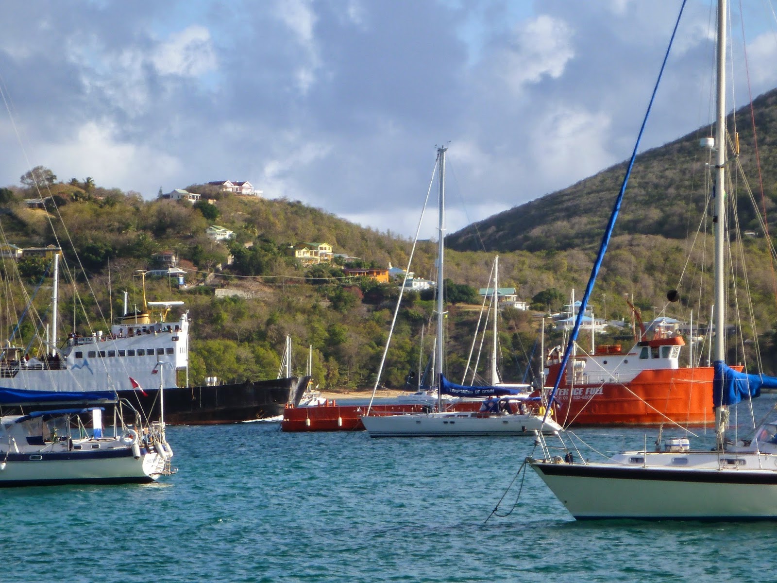 Temptress anchored near the orange fuel/ice/water barge, the inter-island ferry (black hull) just leaving |