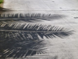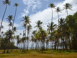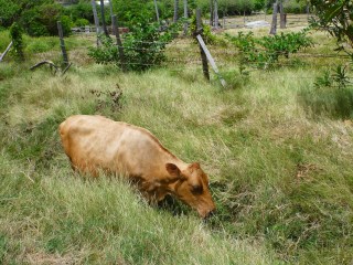 Up the hill and down to the windward (Eastern) side of the island, the narrow concrete road provided stunning views across to other islands and down to coral reefs and sandy beaches. We took a small diversion past some cows across short springy turf through a grove of tall, spindly coconut palms to a beach deserted except for a red golf buggy parked on the sand some distance away, a couple of local sailing boats and some fishing nets. Over another bluff there was a short cut across a beach missing out the lovely gardens of some seriously big homes which we spotted on our return via the road.