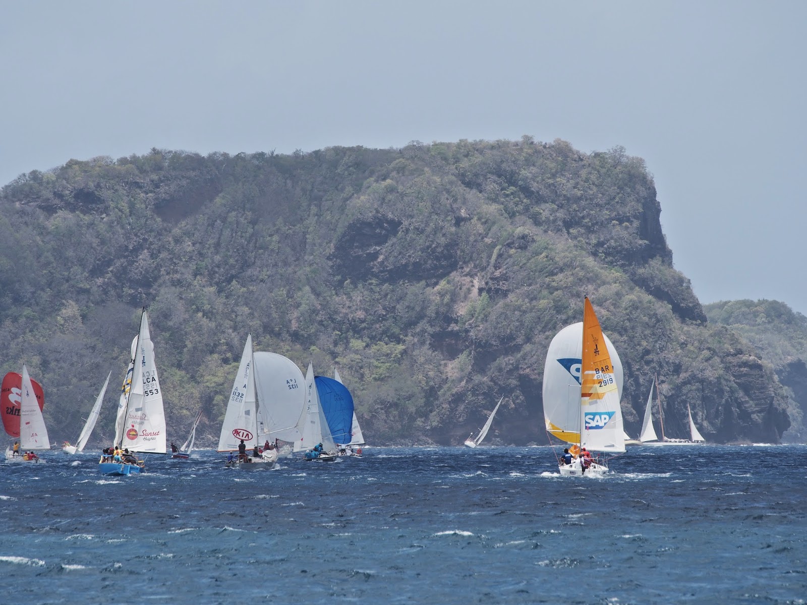 At the point harden up close to the waves breaking on the steep too rocks and round onto a reach to the next mark then it is a long beat towards Petit Nevis off Friendship Bay – do you go in towards the airport on the coast or stay out at sea? The local sailors on board Shian, Gerrard, young Delray and Lewis advised inshore out of the current running west through the gap between Bequia and the off-lying islands.