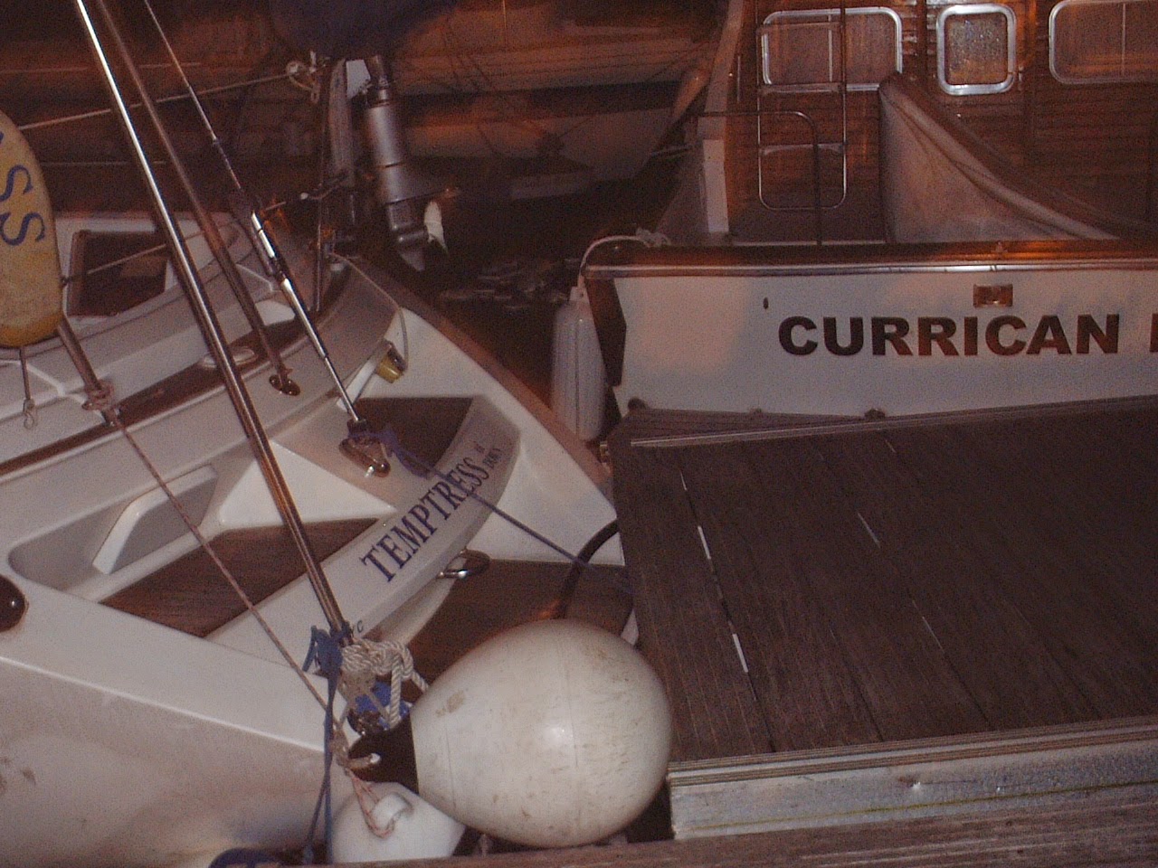 | Temptress – Barbate, Spain March 2002 during a hurricane Wedged in by the pontoon and boats from across the harbour |