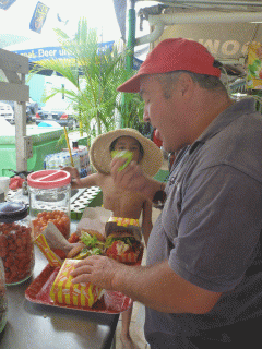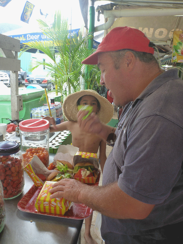 | Piling on the extras watched carefully by Enrique modelling Sym’s sunhat and tasting some enroute |