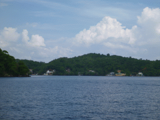 The island of Trinidad is a roughly a fat back to front C shape with the top arm extending out west towards Venezuela. Chaguaramas lies on the southern side of this top peninsula, so is reasonably protected from the easterly tradewinds. It is very pretty with a scattering of green islands in the bay and rain forest clad mountains rising steeply behind. Coral Cove is squashed in at the eastern end of the main run of dockyards and yacht repair/storage facilities that line the shore, just before the fishing harbour at the eastern end of the narrow creek. The hills dip down beyond the creek head funneling cooling breezes down the creek and through our hatches.