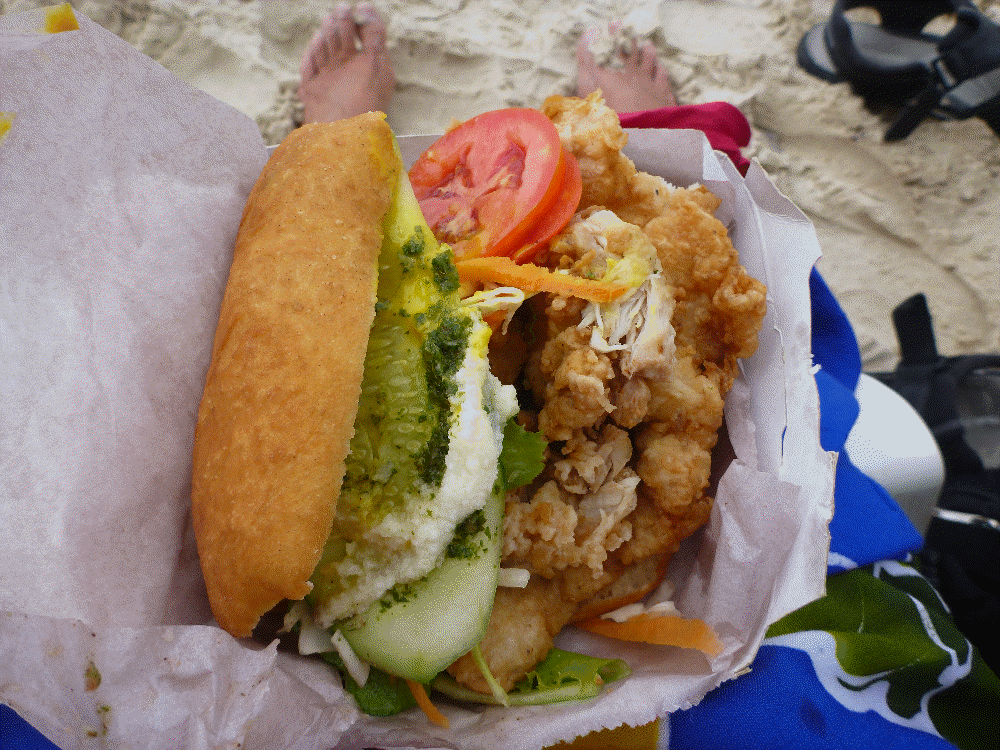 On Thursday morning after a trip into Port of Spain to get a Digicel SIM card, Kevin and I finally met up with friends from Dubai, Symoniez and John, whose home is here although John’s current contract has him working 5 week stretches across the Atlantic in West Africa. John treated us to a slap up curry lunch at Shiann’s – it was lovely to have a really excellent curry again as we have been missing the delights of Ravi’s, Eric’s and our other favourite Indian eateries in Satwa and Karama. Friday was Emancipation Day, the second national holiday this week Tuesday having been Eid, so the four of us plus Sym’s young nephew Enrique headed to the beach. Maracas is a long narrow curve of tree fringed sand on the north coast of Trinidad popular with local families; Trini has a very mixed population of Afro-Caribbeans, Indians and a smaller number of people of European descent. It being a holiday everyone was at the beach with their buckets and spades and surf boards (not that there was much surf), beach loungers are about £2 per day. On the other side of the road are a collection of restaurants all vying to sell Bake ‘n Shark the local speciality. At lunch time Sym took us to Uncle Sam’s for what she claims is the best on the island. It certainly was tasty and we had great fun directing Kevin as he loaded the fried shark filled buns with salads and various dressings – he was particularly heavy handed with the garlic sauce but the spicy batter around the shark still won out! It was a good job we were at the beach as eating a Bake ‘n Shark is a messy business, a quick dip in the sea soon washed off all the sauces that had escaped.