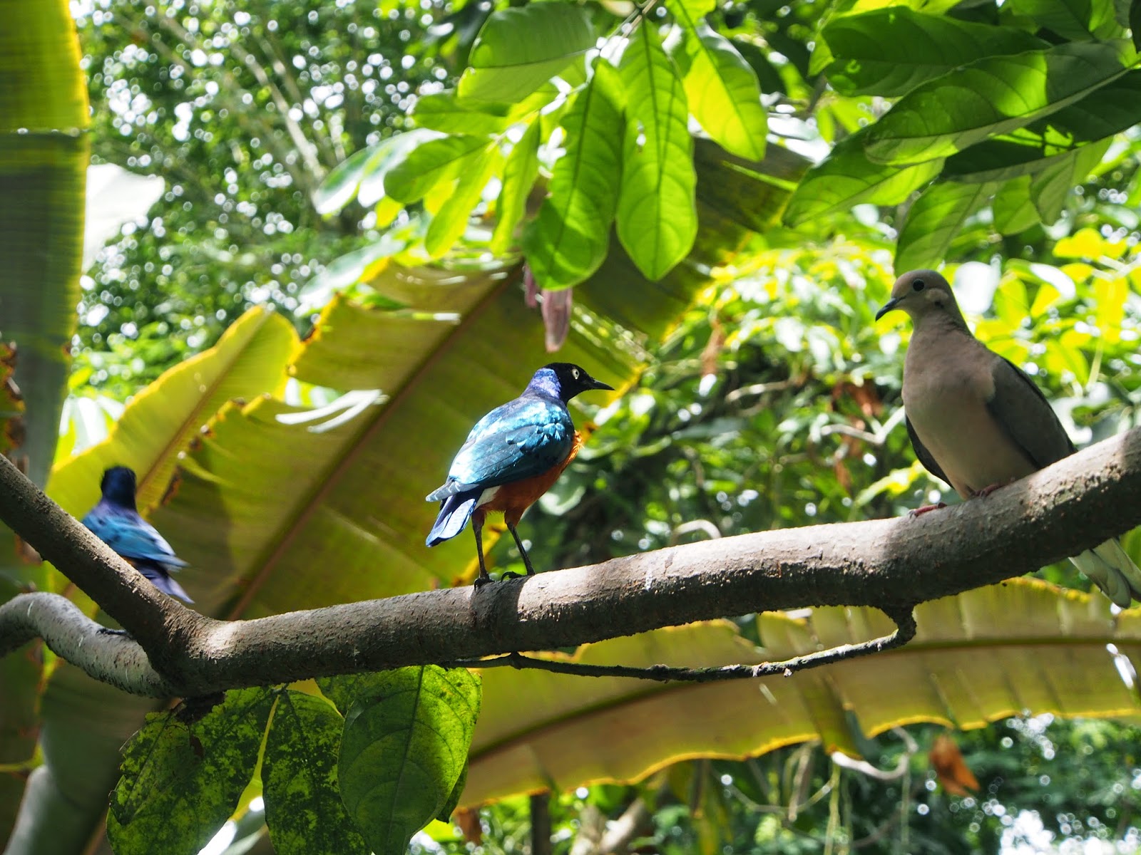 Our tactic of arriving just after mid-morning and leaving when extreme hunger set in during the early afternoon meant we missed all the shows – parrots feeding, hawks flying, pelicans being fed and so on. Despite this we enjoyed our walk especially in the big jungle filled aviary where the punk pigeons, the purple finches and the brilliantly coloured starlings kept us entertained. Setting a bird park in a tropical region is genius – the exotic rainforest plants with their blowsy blooms and generous greenery make a superb backdrop for the splashes of colour of feathers of every hue. Seeing lovebirds not paired up on a perch in a UK petshop, but flying freely back and forth from a bird table covered in fruit and seed was a treat with their trim colouring and beady white rimmed eyes – they do look like they have been painted. The flamingoes splashing through the fountain and sifting the mud around the lake shore looked completely at home even though they are normally found in much drier climes.