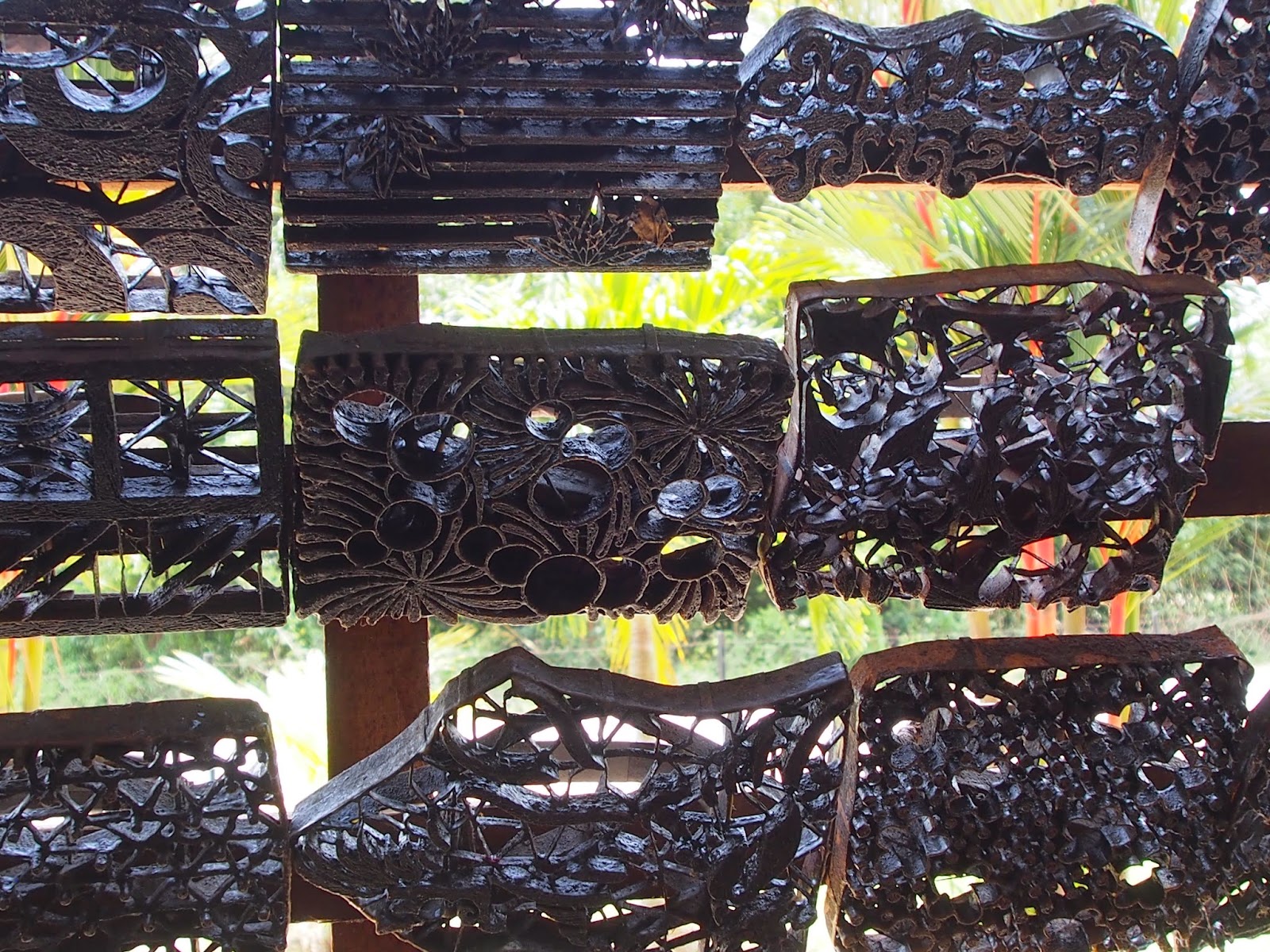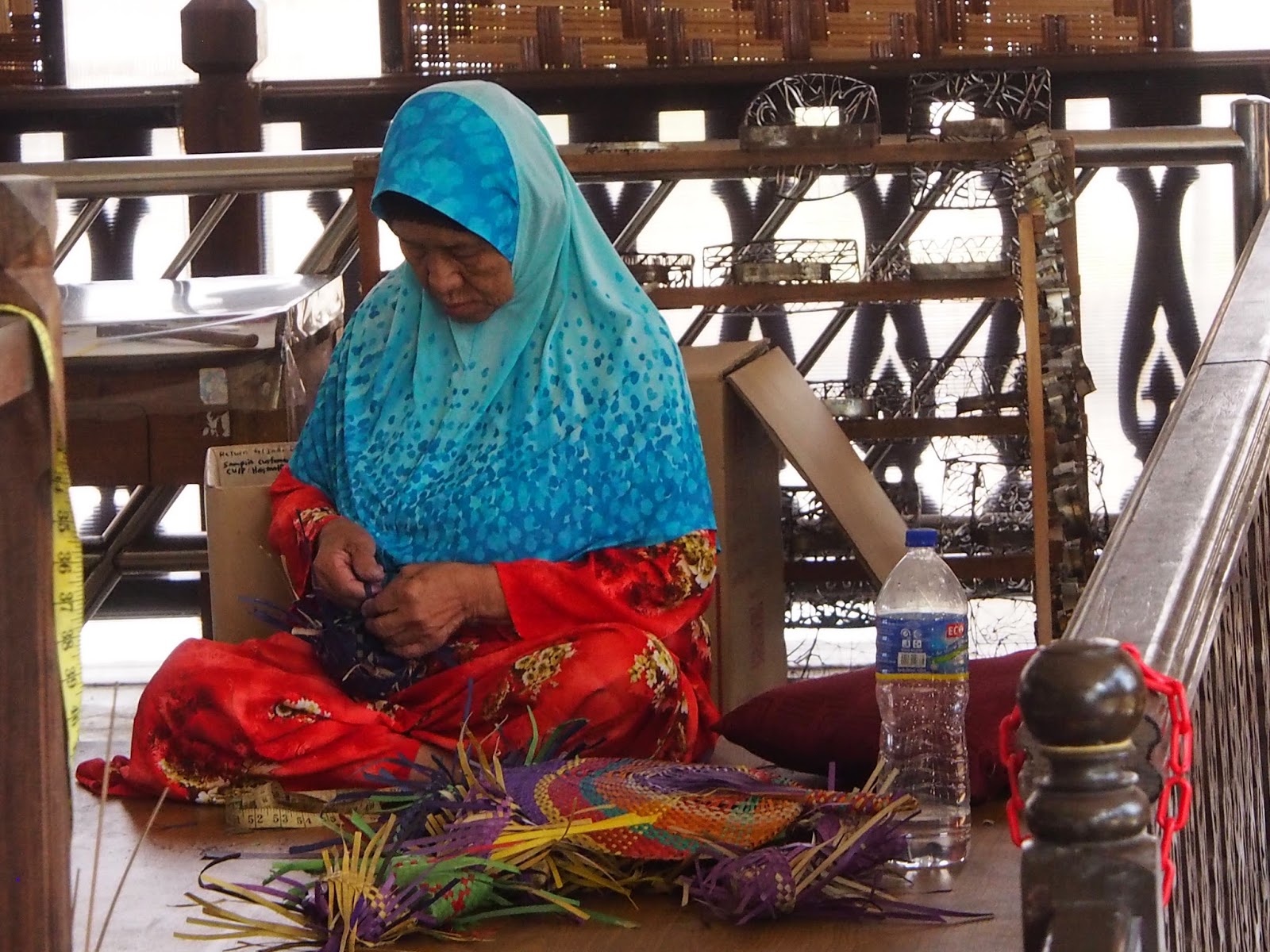 Lunch was included in our tour fees and was chicken rice at a beach side hawker centre – I’d guess our guide was used to taking Europeans who have a preference for less spicy food. If he had but asked us there were several stalls serving Malay dishes that we’d have liked to have tried. Onward to the best bit of the day for Rhona and I – the craft centre. Another blatantly commercial venue designed to prize money from tourists however we did get to see a little glass blowing, an elderly lady making woven baskets, hats and smaller items from dyed palm fronds and a young lady sketching out a design on a length of white silk prior to dying it. There were other batiks both cotton and silk drying in the craft area. Up a few more steps was a huge hall full of batik for sale – cotton, hand printed, factory printed as well as gorgeous songket fabrics. Songket is a local tradition brought over form India many centuries ago – the cotton or silk fabric is woven with gold or silver threads. It can be heavily ornate like brocade or a lighter design.