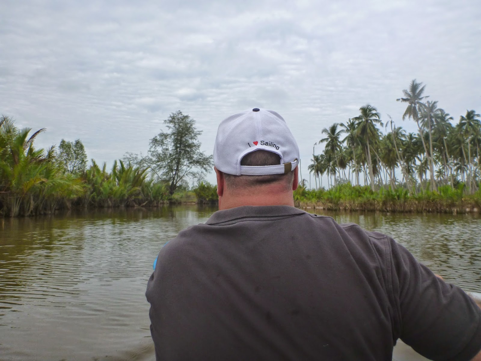 After breakfast Kevin and I decided to hire one of the resorts kayaks for an hour or so’s exploration of the wetlands around Terrapuri. These were hefty GRP double man boats but the hotel staff willing carried ours down to the water. There wasn’t a buoyancy aid big enough to fit Kevin, his shoulders being much broader than the average Malayan. Similarly the kayak was built for the local market and the seats a cosy fit. Kevin couldn’t get in the rear one at all and only just fitted the slightly broader and longer front space so I ended up paddling with my knees bent up. We were told “don’t go out into the big river” which was like a red rag to both of us so guess where we headed! The inlet through wetlands was shallow with the tide ebbing gently so for a bit we found ourselves almost punting. The mud was an evil smelling black ooze like Langstone Harbour or Newton Creek in the Solent so we felt at home.