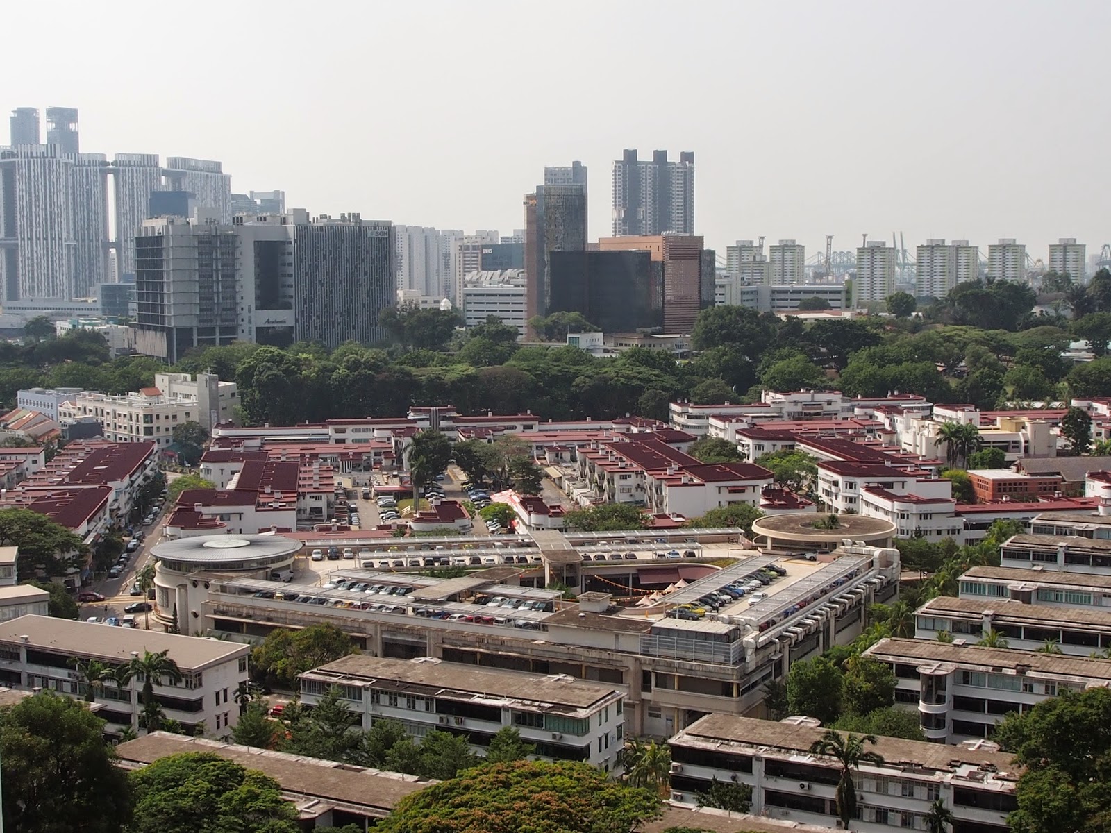 | View over Tiong Bahru towards the grey towers of SGH; the triangular building is the market |