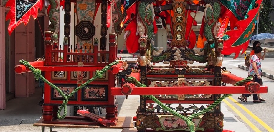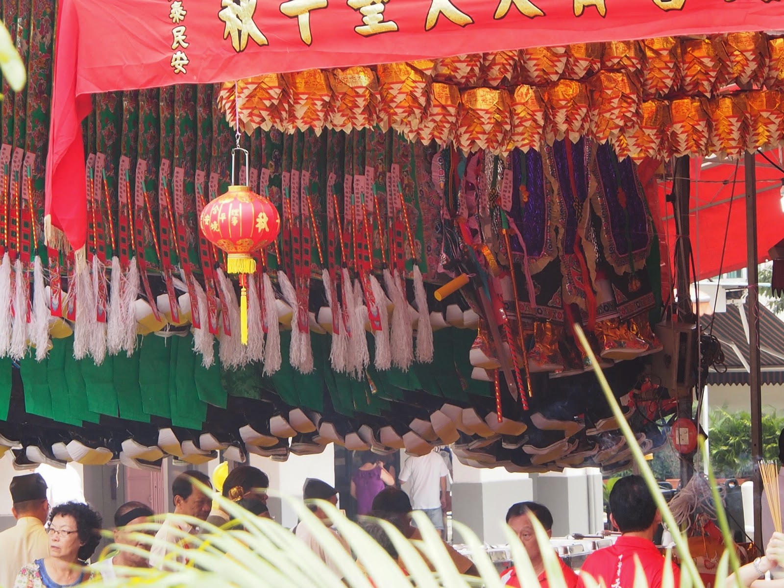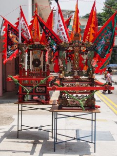 What of the monkey god? As far as I can tell he was a character in a 16th century novel which in turn was based on folk stories. Born from a stone Sun Wu Kong was a fierce character, a sort of demon, who was tricked into wearing a band around his head that tightens when a special chant is made causing the god great pain and hence controlling him. Today Taoists believe he helps them in their business lives and he has been worshipped in Singapore since the 1920’s. On the occasion of his birthday there is lion dancing and an afternoon parade around the streets of Tiong Bahru and later a performance of Chinese Opera on the street corner opposite the Monkey God Temple.
