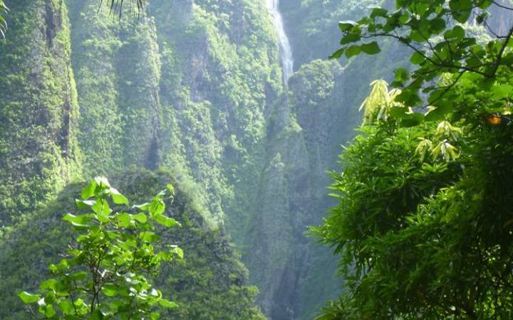 Eventually the road dwindled to a narrow path still with the massive block work supporting it on the downhill side as it wound its way gently up through the valley above the river. At times we were glad of the blocks to walk on away from the ankle deep mud. Green clad rock pillars like carefully tended oversized garden fir trees stuck up from the valley floor on the opposite side. Amazing thin, conical structures that rise several hundred metres. The whole scale of the landscape on Nuka Hiva is beyond anything we’ve seen.