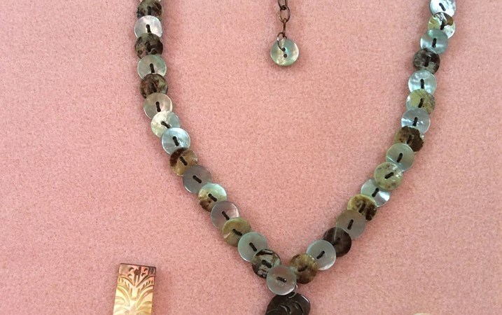 Later in the week I spent a pleasant morning dreaming up ideas with some of my bead hoard spread out on the saloon table. The tiki man has now become the focal point of a necklace by combining it with some pale blue mother of pearl buttons bought in John Lewis years ago. Threaded on black waxed cord with some “bronze” chain and a simple hook clasp I was pleased with the result, a homemade Tahitian souvenir. All that is needed now is an occasion to wear it.
