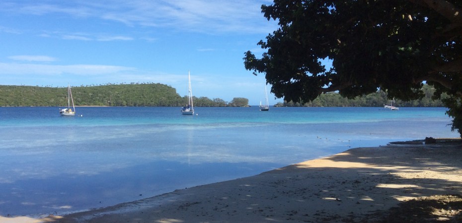 Inside it is delightfully calm, the breeze makes it over the low wooded hills keeping the boat cool whilst a couple of islets surrounded by coral just off the eastern shore keep the fetch to a minimum. The green hills and limestone cliffs completely surround this tiny patch of ocean making it seem like an inland lake. Snorkelling around the little island closest to Temptress after we had moored revealed the coral not to be in good shape but there were lots of bright coloured starfish and hundreds of sea slugs in a range of weird shapes and sizes from the usual foot or so long fat black or brown slugs we are familiar with to long thin things that look like sticks. The water is teeming with fish and the local guy with an unpronounceable name who we donated a spare bilge pump to said there is a tasty snapper like fish that is good to eat if we want to bottom fish. He was delighted with our gift and brought us a bag of fruit from his garden and a pair of earrings made from tiny pearls he has grown here in the lagoon.