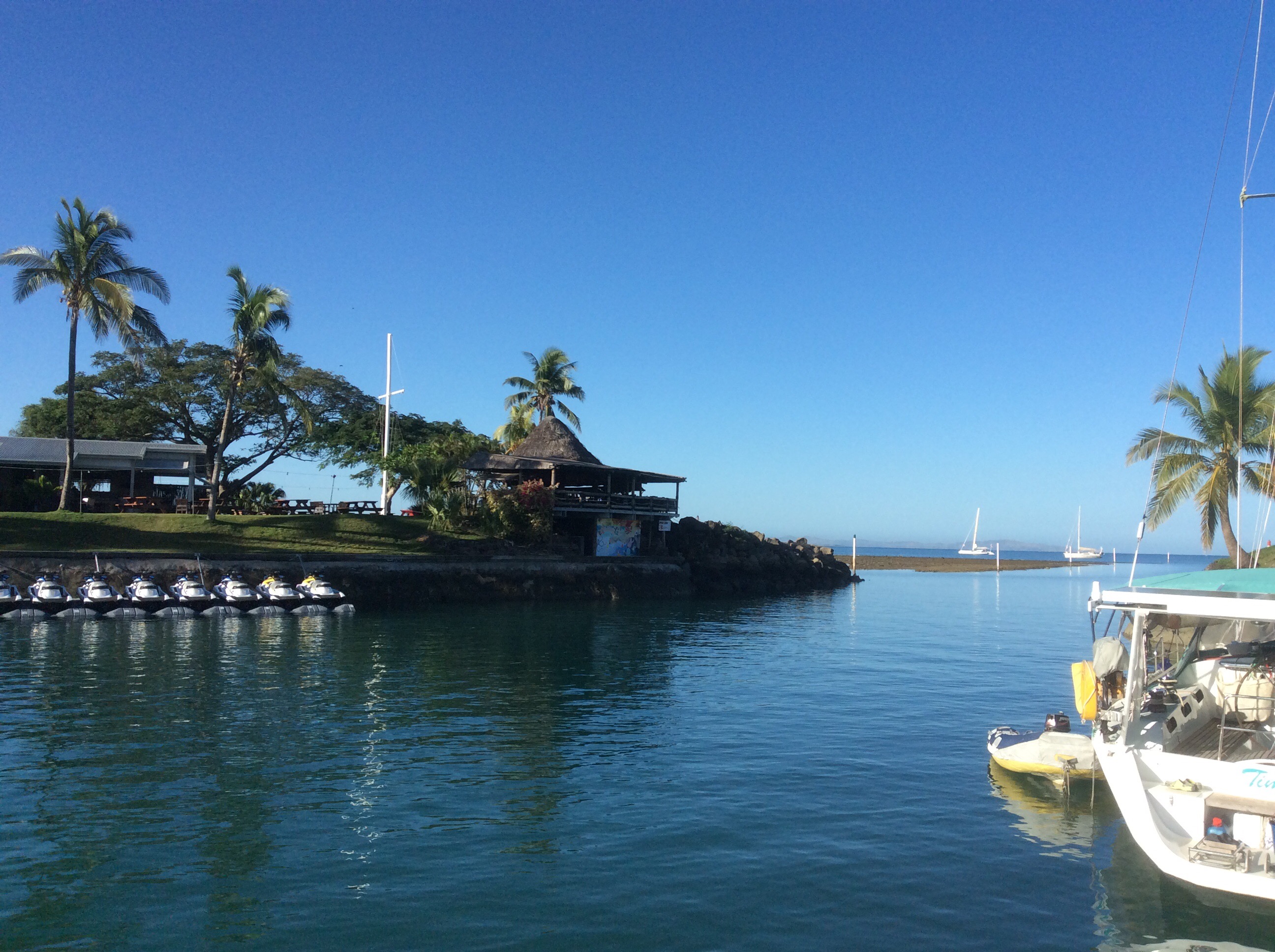 The land slopes down gently beneath the steep rocky peaks and the shores are fringed with mangroves. Wide, shallow reef strewn bays on Temptress’ port side, wide reefs with the occasional sandbank just beginning to show above the falling tide lie between us and the sea to starboard. The inside passage here winds its way west, keeping the crew busy looking out for the navigation marks through the dogleg turns. The beacons are mostly rusting, many missing completely, some showing only a foot or so higher than the water level, however as we’d been told the important ones are still there marking the ends of the reefs. Sixty odd nautical miles of motoring through the most amazing scenery later and still inside the reefs, we dropped the hook in pretty Saweni Bay a few miles west of Lautoka, Fiji’s second largest port and city after the capital Suva.