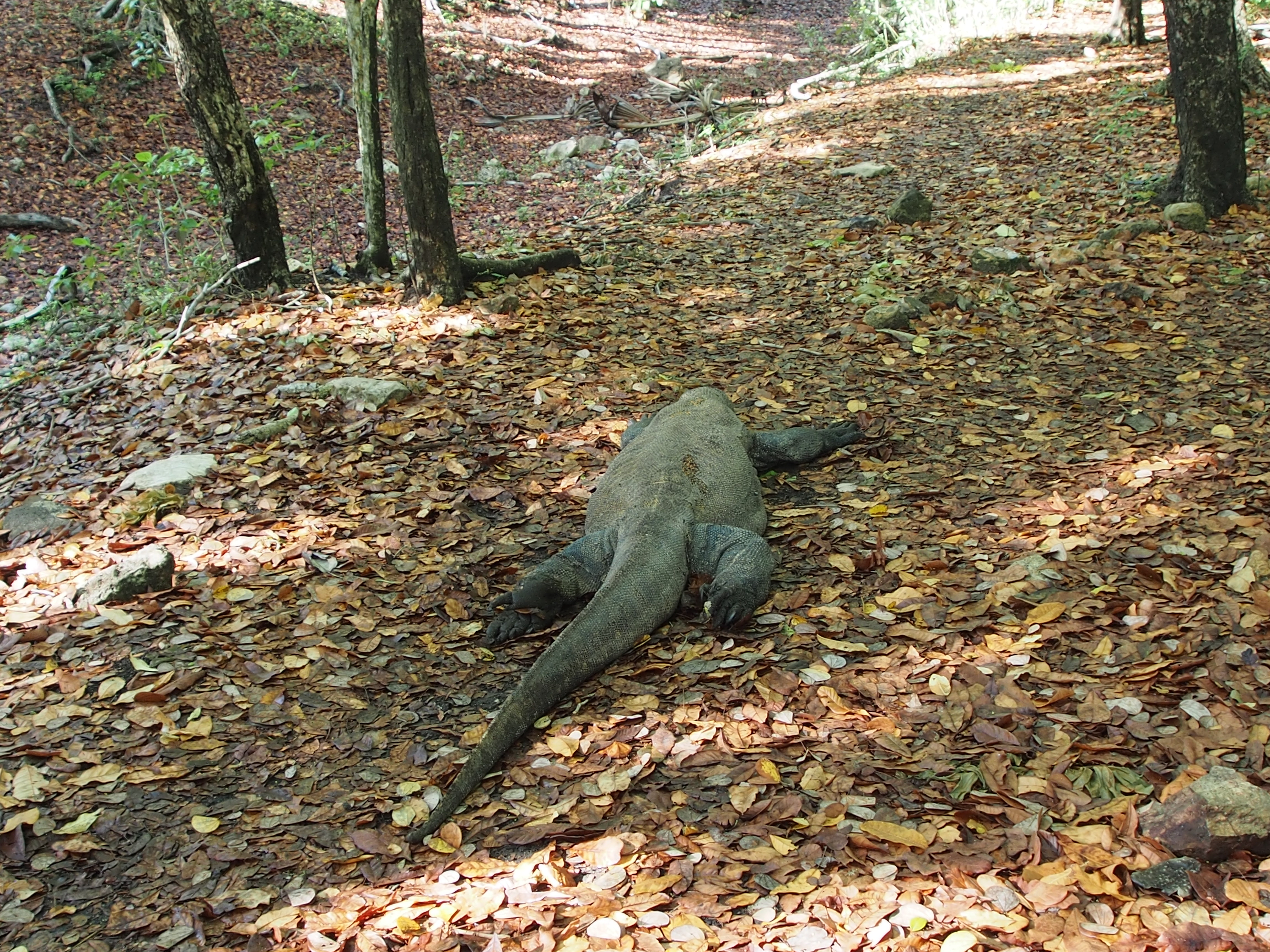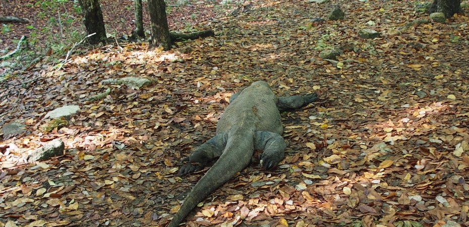 Together with the crew of Why Not – Chris, Michelle and Sean – our first jaunt after a night at anchor for swimming and snorkelling off Pulau Sebayur was a dragon hunt but first we had to find the correct bay on Rinca, this island being apparently a better one for seeing Komodo Dragons than the island they are named after. Our information gleaned from other cruisers gave us a waypoint but charts in this part of the world do not conform exactly to WGS84 so the waypoint was neatly on a headland between two bays. We choose the wrong one at first! Eventually by watching the local boats we not only worked out which bay but also a safe route through the reefs and found ourselves in a lovely spot at the head of a narrow deep bay; the trees around were full of birds of prey (we think sea eagles and brahmin kites but could have been ospreys too) and monkeys. The following morning early five adults and two twelve year old boys set off on a two hour trek from the Loh Buaya Ranger Station to hunt down a few dragons.
