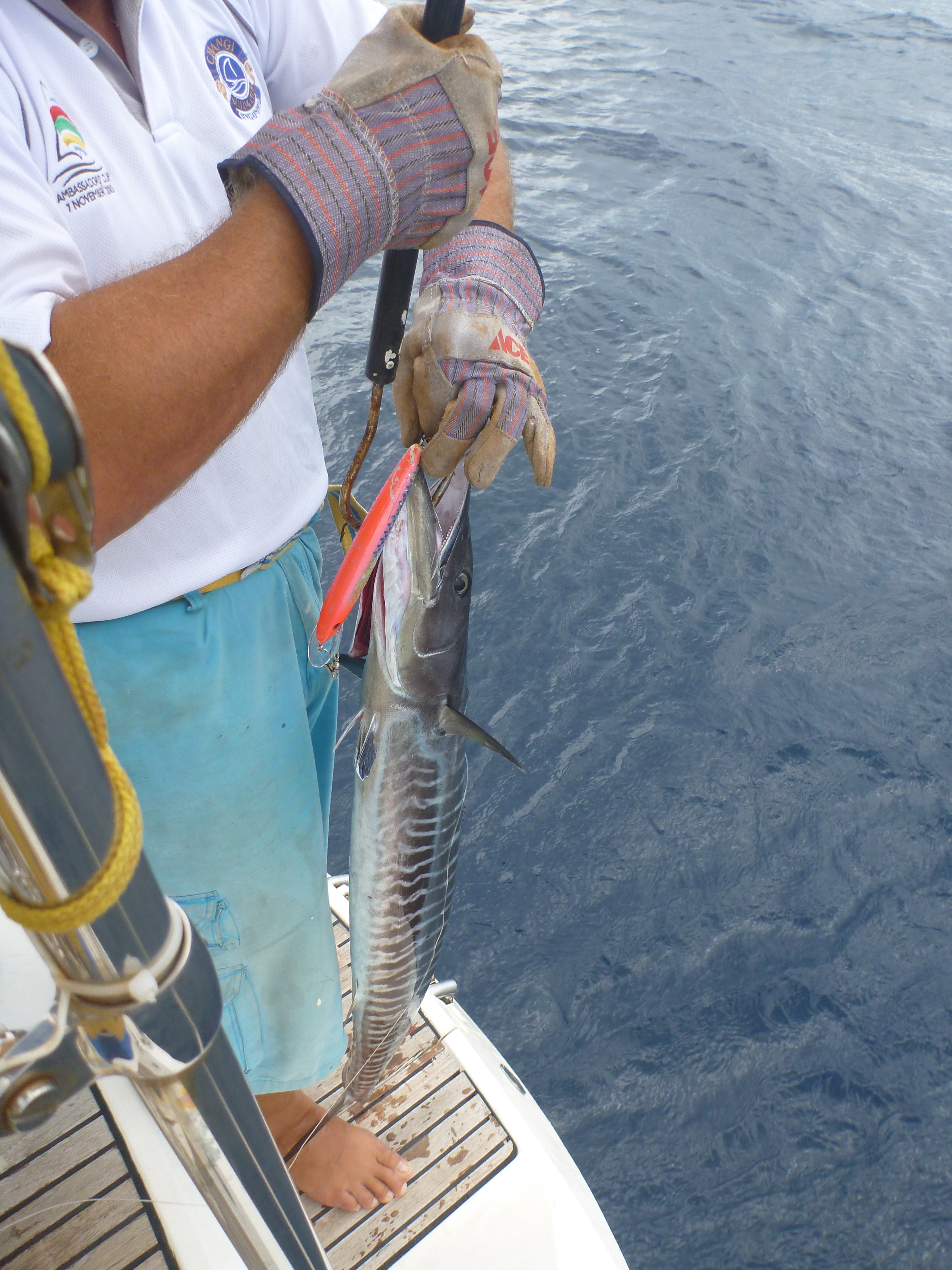 On Wednesday as Temptress passed between Pulau (P) Kamudi and Karang Takat we finally found ourselves in the midst of a downpour. Fortunately it happened after we’d processed into the tiny freezer box eight meals for two from our first fishy catch since the passage to Kupang from Darwin – another large wahoo. A welcome supplement to our dwindling fresh supplies.