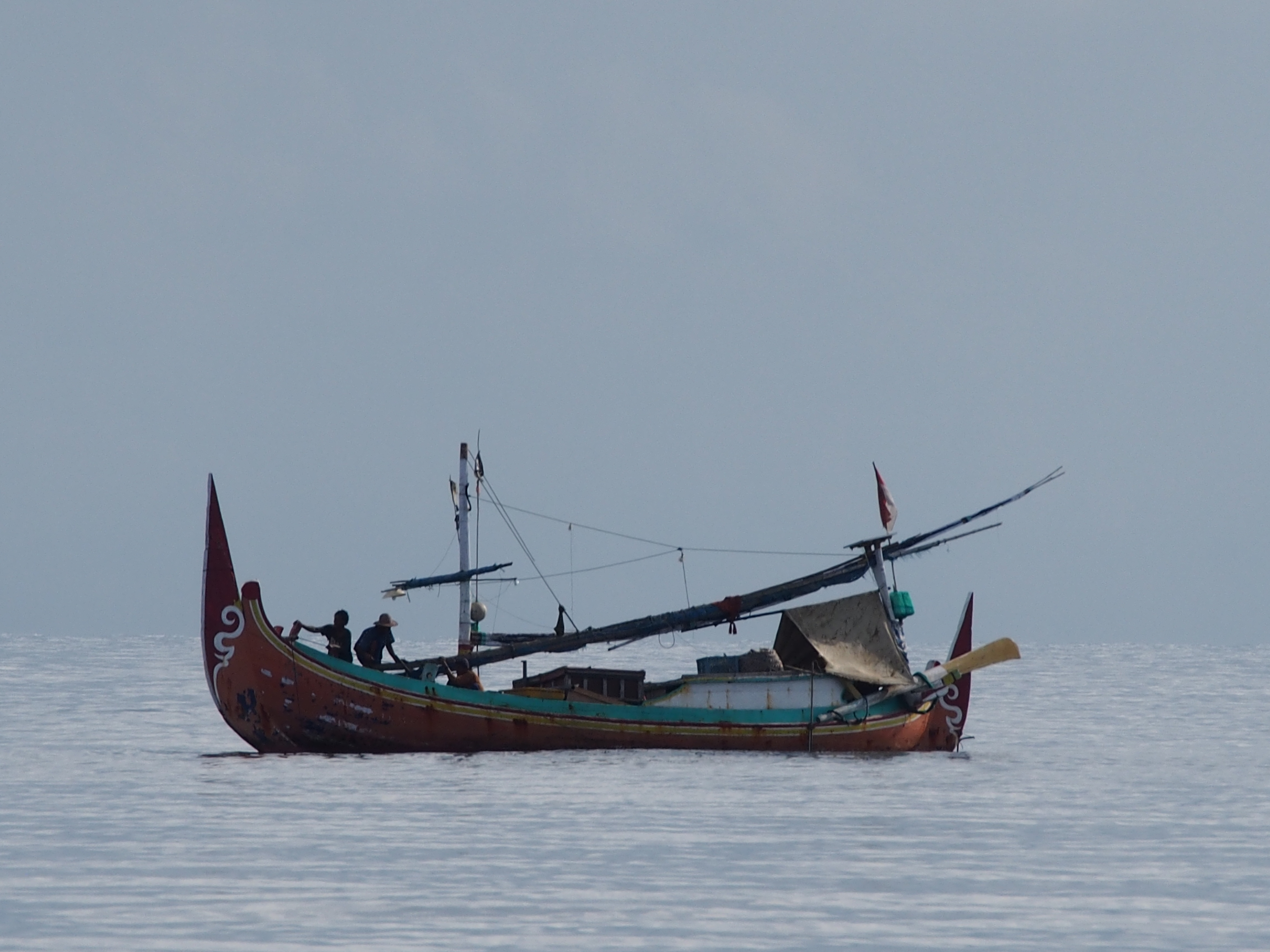 Bawean was approached in another torrential downpour so thick we scarcely spotted a local fisherman in his small boat hauling in a line catch, not that he saw us either. We missed each other by metres. Once at anchor in four metres in the bay the last of the day’s sun came out. It was a pretty place with trees and palms reaching down to the shore and a scattering of red roofed buildings amongst the trees indicating it might be a little less impoverished than some Indonesian islands we’ve visited. A local came by in his boat “what want?”, “solas” came the skippers response but the man moved off either he hadn’t heard or he couldn’t fulfill our request for diesel fuel.