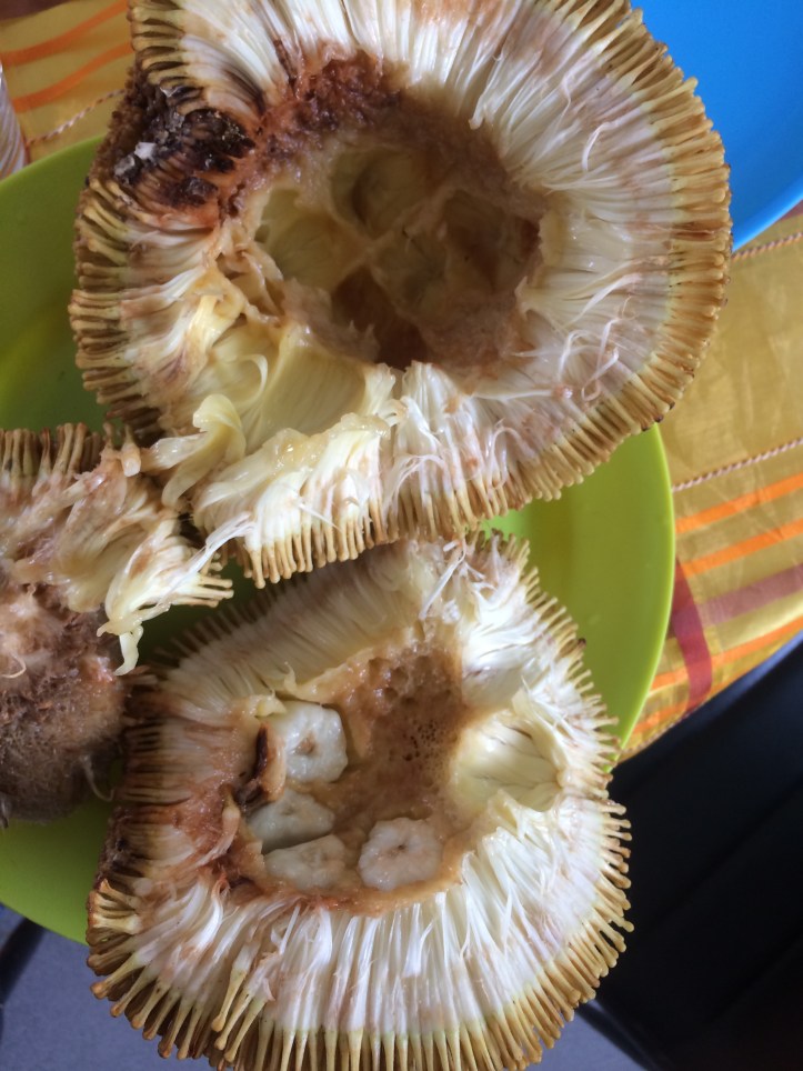 On a tree by the cafe hung large fibrous globes, on asking what they were one was picked and brought to our table to be hacked open. Nestling inside were delicious little white fleshy fruits. In appearance like small jackfruit segments but in taste sweet and pleasant like ice cream or a banana. This is the Borneo Tarap, found only here and in the Southern Philippines. Our table happily devoured as many as could be picked for us until we were stuffed again.
