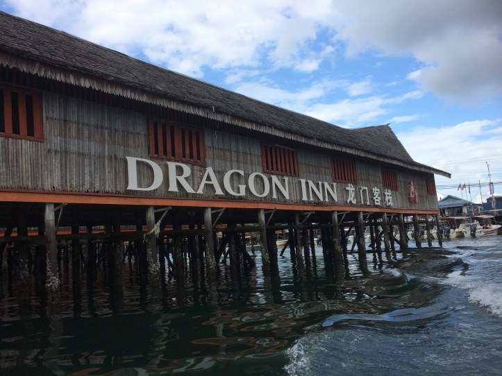 Semporna is the Wild West; a scruffy border town full of dive and snorkelling shops, tatty restaurants and cheap hotels. The pavements are broken, small grubby barefoot kids hang around begging and the stench in the narrow streets lined with market stalls was horrendous. It seems no one is expected to linger here and no one is investing in the things that would improve the locals lot. The channel between the town and the islands is lined with wooden houses on stilts. Everything – sewage, plastic, rubbish – is discarded directly into the sea. I was rather glad the fishing fleet had this year refused to move out to make way for an overnight stop by the rally fleet. But we had a wander through the streets lined with parked cars and queuing traffic, I managed to top up my phone but the skipper decided the lengthy queues for the ATMs ( there are only two banks in town) was just not worth it. After a good lunch at the Dragon Inn Hotel we saw Karin into a taxi and headed back to the anchorage.