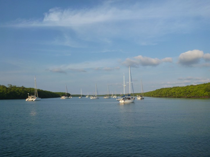 That night an hour or so after we’d gone to bed a storm swept through the anchorage. The anchor alarm going off woke us, Temptress was dragging towards the shore. In the north or northwest winds the fleet was completely exposed. As the bow bounced around in the big wind driven waves the chain slipped out of the bow roller and jammed. Imagine standing in a bouncing powershower fully clothed with someone hurling buckets of seawater at you. My glasses were impossible to see through as I tried to work out why the windlass wasn’t able to bring the chain in and to add to our woes one boat decided to shine a powerful searchlight at us which did nothing for our night vision plus the resulting shadows made it even harder to see what was going on over our bow but eventually I spotted the problem. I swapped roles with the skipper so he could sort it out which using the snubber he was eventually able to do after an hour of driving round dragging the chain trying to avoid other boats both at anchor or dragging themselves. All the time the tropical downpour was horizontal and painful even in the shelter of the cockpit. Soaked to the skin but free we set off into the bay, deciding that our best bet was to motor back and forth on a reach until the storm abated.