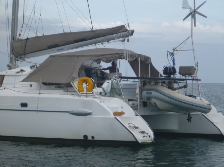 As the engine dropped to the deck it slithered off to the dark recesses ofTemptress’ false deck. Quickly Karin and the First Mate closed all the hatches. We put out a call on the VHF – Rod, Grant and Tan responded. Tan brought welding gloves, Grant a boat hook and I handed Rod our BBQ tongs before ensuring the washboard was in place. Us girls were safe below. Kevin undid the 16 screws that hold the false deck in place, checking our unwelcome stowaways position Kevin carefully lifted a corner, Grant pounced and secured it with the boathook then Rod-Steve-Irwin wearing the gloves, grabbed it with the tongs which it promptly attacked and threw the snake over the side. Phew. The boys returned to their boats and Kevin, once he had calmed down a bit fastened down the deck again. It was several hours though before he stopped shaking. The next day he looked up the cobra – a spit in the eye can cause complete blindness unless rinsed immediately with copious quantities of water, a bite usually results in the victims death. That was one close shave for the skipper!