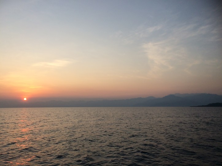 Dawn over Mamuju was beautiful. The sun rose over the mountains that back the city. We skirted the west coast of a large island that sits in the middle of the bay and anchored in four or five metres off the curving wall of the town plaza that is backed by a large mosque. Just as we completed our boat tidying tasks, before retiring to our bunks to sleep, five uniformed officials in tiny speed boat painted in coastguard colours motored around, ostensibly fishing out plastic with a net but mostly photographing the boats. All four boat crews then retired to bed only to be woken by a visit from officialdom after just about an hour’s kip.