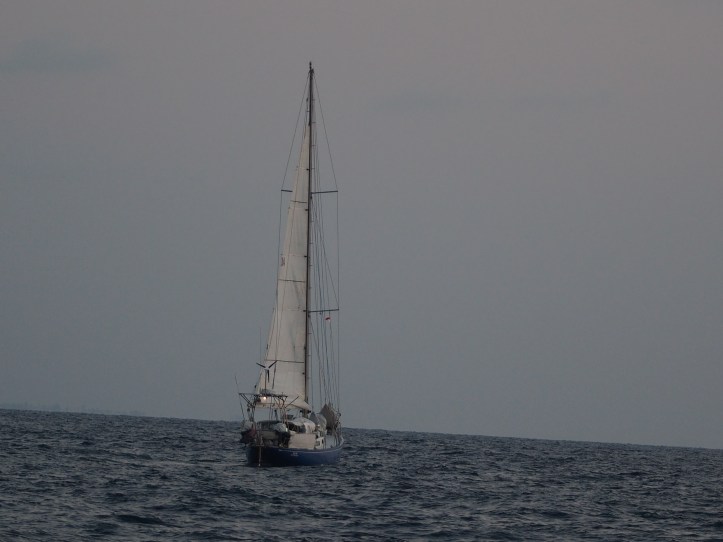 After an hour of pleasant sailing the wind died just as it did yesterday. I’d guess it was a land breeze left over from the night, the sea breeze will probably take over once the sun is high enough. For now though the four boats are motoring. We finally caught a fish but it got away after a few minutes tussle, the lure’s slightly rusty triple hook was straightened out so that’s why we lost out again on a supper. The hook has now been replaced.