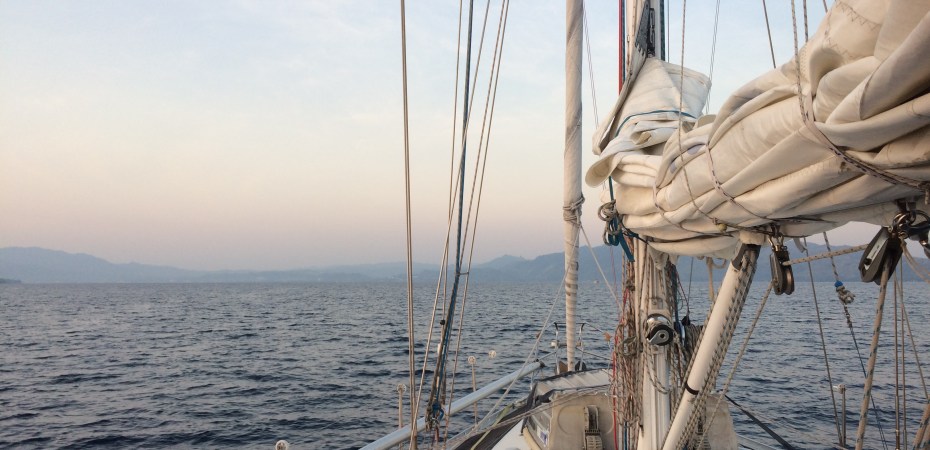 After an hour of pleasant sailing the wind died just as it did yesterday. I’d guess it was a land breeze left over from the night, the sea breeze will probably take over once the sun is high enough. For now though the four boats are motoring. We finally caught a fish but it got away after a few minutes tussle, the lure’s slightly rusty triple hook was straightened out so that’s why we lost out again on a supper. The hook has now been replaced.