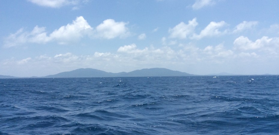 Eventually we gybed at 05:30 between the reefs and onward. Then at 09:59 I looked from my crochet and off to port was the unmistakable grey smudge of a hill in the distance. Land Ho! was muttered quietly for the skipper was sleeping. Quite shortly after, the hive mind that is Temptress’ crew both decided it was time to gybe again as we worked our way through the off-lying islands and reefs. We left the gennie where it was then, furling it for the following gybe and didn’t bother unfurling it. The wind slowly became lighter. Eventually when the speed dropped to five knots we finally moved the pole back to the port side and poked out the gennie again. When we’d done moving lines and pole and sail Temptress was almost sailing the course to the next waypoint! Who needs a gym when you have a sailing boat.