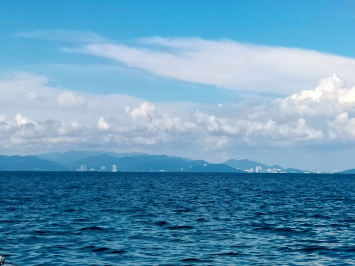 Having left Pangkor on the morning tide on Wednesday we happily took the north running ebb up the coast towards Penang. The sea was glassy flat, the sky cloudy. Forty or so miles later we dropped the hook off the south coast of Pulau Kendai, a small steep to jungle clad island just south west of Penang. Nothing remarkable except a downpour and distant thunderstorm during the night.