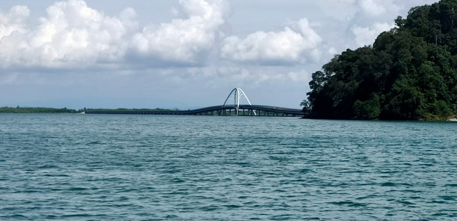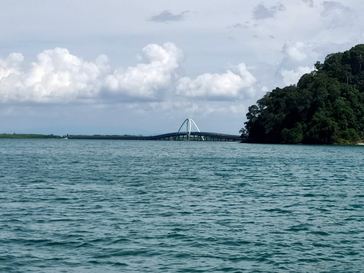 However this is possibly the only island oasis of its kind served by a dual carriageway running over a causeway complete with suspension bridge! Intrigued we turned to Google – built between 2002 and 2005 by the Kedah State government the causeway and bridge cost 120 million ringett (around 54 million sterling). From the boat we can’t see where the road terminates but a satellite view shows it simply reaches the island shore to end in a dusty reclaimed area. Apparently they had hoped someone would build a powerplant on the island. For now it serves as a platform for locals to fish from and as an intriguing attraction for yachties sailing up and down this coast.