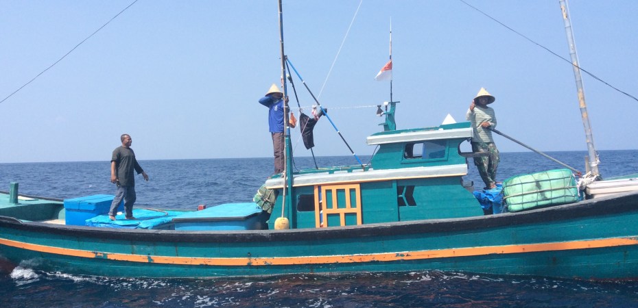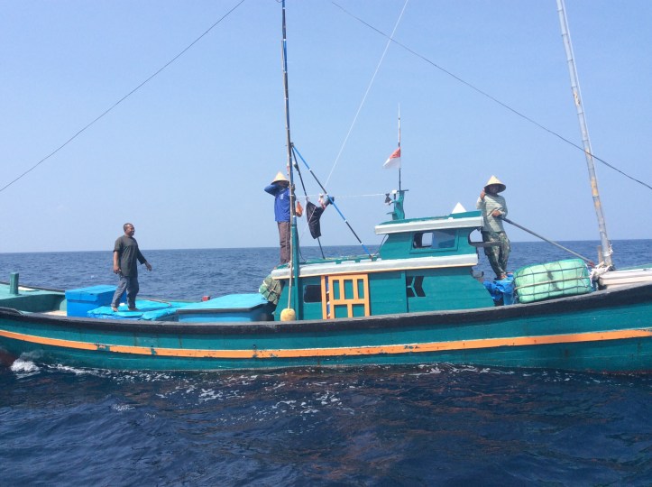 14:00 Temptress has been under sail with the genoa poled out since after breakfast. The noon to noon run was an excellent 163nm, albeit over a 25 hour period. Our peaceful existence is broken by shouts from an Indonesian fishing boat. There were two boats, three men a piece, we had a pigeon English conversation in the way that only Indonesian’s conduct it. ‘Sir, Sir, fish fish?’ Proffering a large tuna the man standing on their foredeck shouted loudly. When it was turned down as ‘we have’. ‘Whisky, whisky?’ Sorry none to spare. ‘Water, water?’ Yes have you a bottle? ‘Beer, beer?’ No sorry. Their spokesman changed tack ‘where you going? Aceh, Aceh?’ ‘India, India’ was our response. ‘Oh long way.’ He swept his arms out encompassing his mates ‘Aceh, Aceh’. Meanwhile the other boat was circling taking photos. Then the requests were gone through one last time adding an extra one of ‘ciggie, ciggie’. Photo call complete both boats headed off south towards Sumatra.