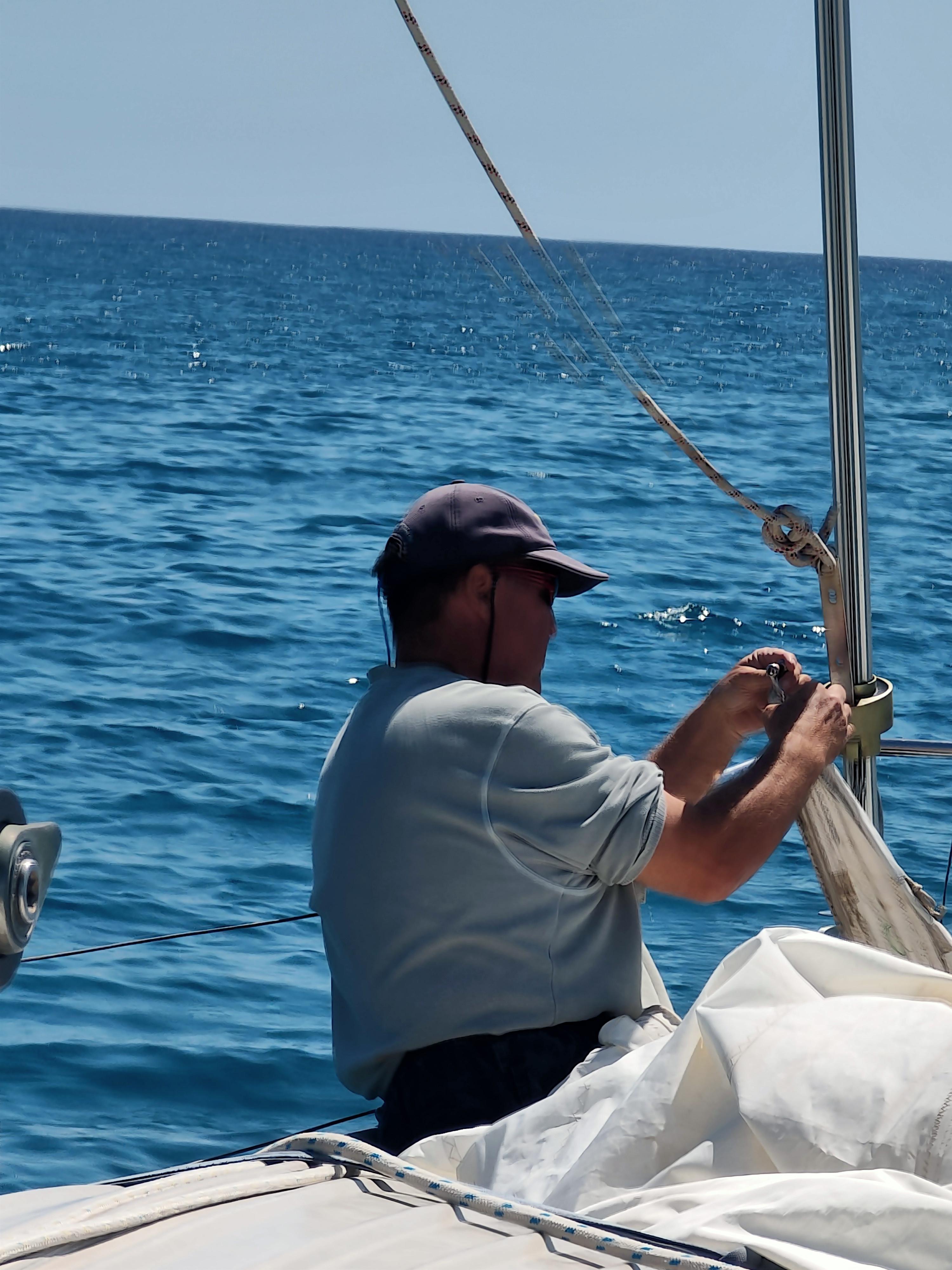 Meanwhile with the wind down we can manoeuvre the gennie along the side deck to the cockpit to machine stitch a patch on either side of the tear. It’s a puncture wound caused by a split pin securing the rigging. Usually these are taped to prevent such damage to sails and crew but the waves washing over the deck during the trip north washed away much of the sun and sand damaged tape allowing pointy ends to poke through.