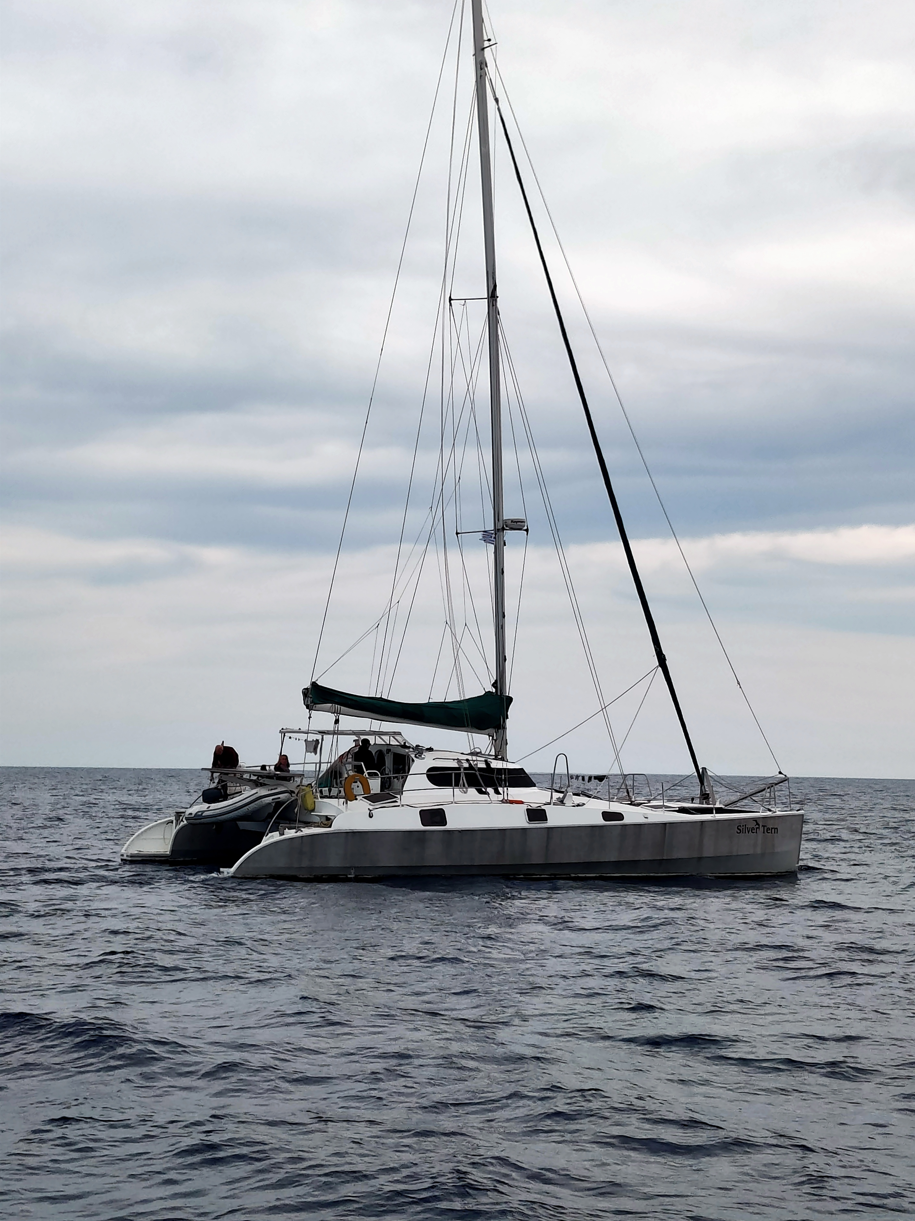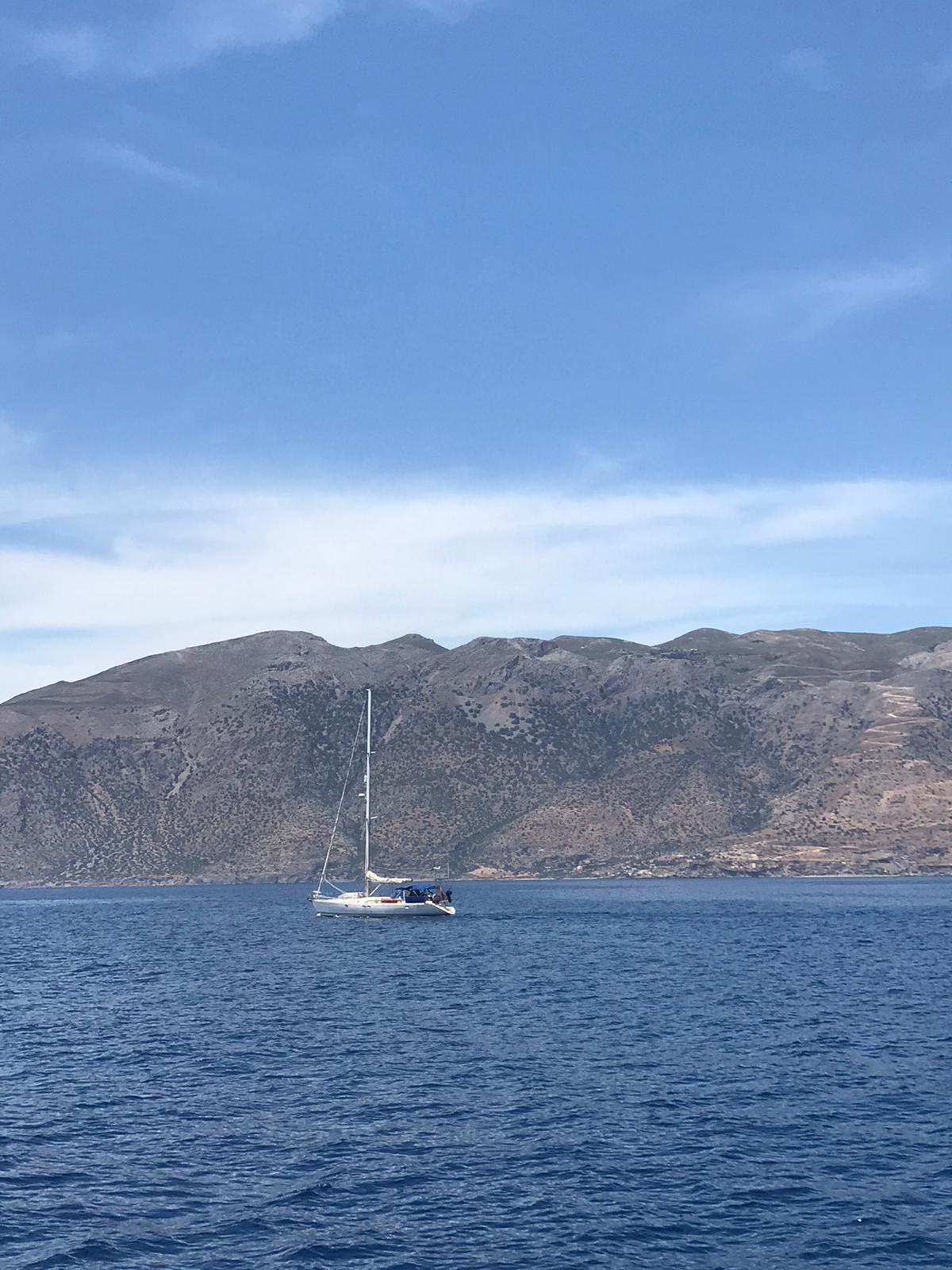 By supper time Temptress had motored as far as Crete’s first corner where the coast turns an abrupt 90 degrees to head north for a few miles. We aimed from there to the western end of Crete some sixty nautical miles away, should reach there around dawn. Ahead lies a line of what can only be described as fog, above which snow covered peaks catch the last of the sun. We say farewell to Silver Tern. Their intention is to work their way north and west towards the Straits of Messina whilst the winds are favourable. Sicily is just under 500 miles away. In our last moments together we passed over one of Temptress’ old halyards so they have a spare as their last spare is now in use as a topping lift.