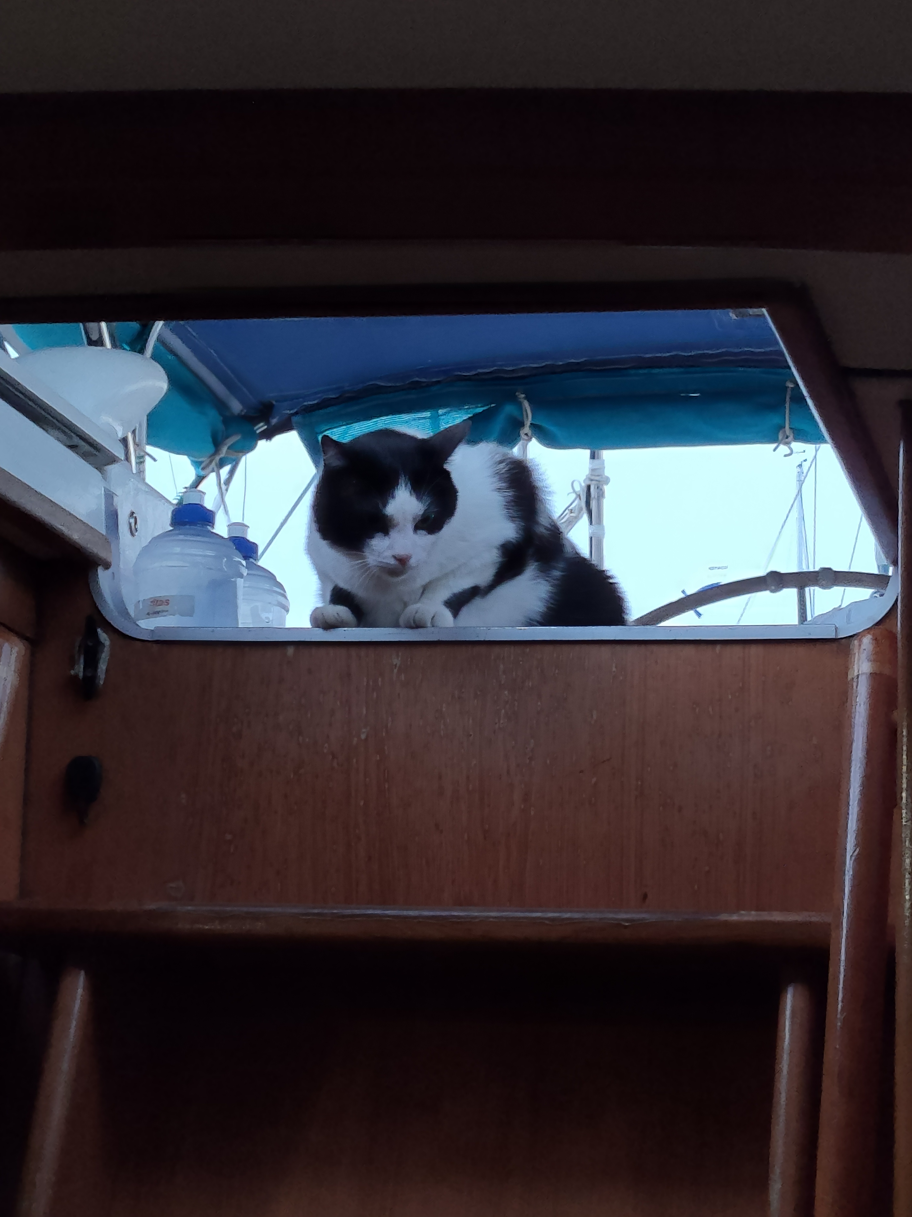 Friday night was a stormy one, the wind buffeting the bow, causing the boat to jerk about on her mooring lines. Uncomfortable but not dangerous. Meow Meow, the marina cat finding Full Flight gone, took refuge under our sprayhood on top of the sailbag. He was snoozing there when we woke early on Saturday morning. With the wind light and the surveyor due to arrive at 09:30 and potentially wanting to take the boat out for a trial sail we hastened to put the genoa back on the forestay as well as get the boat stowed for sea.