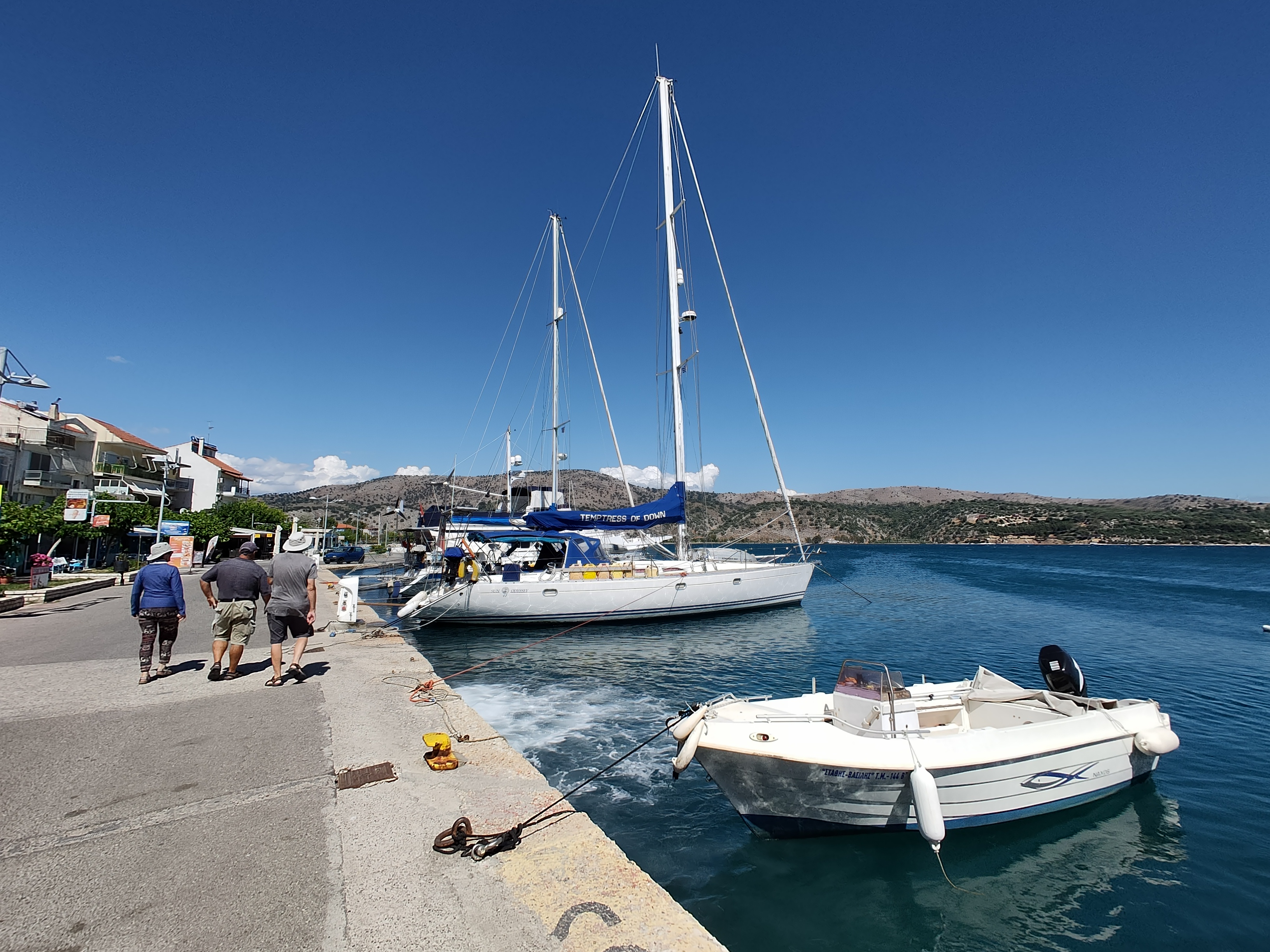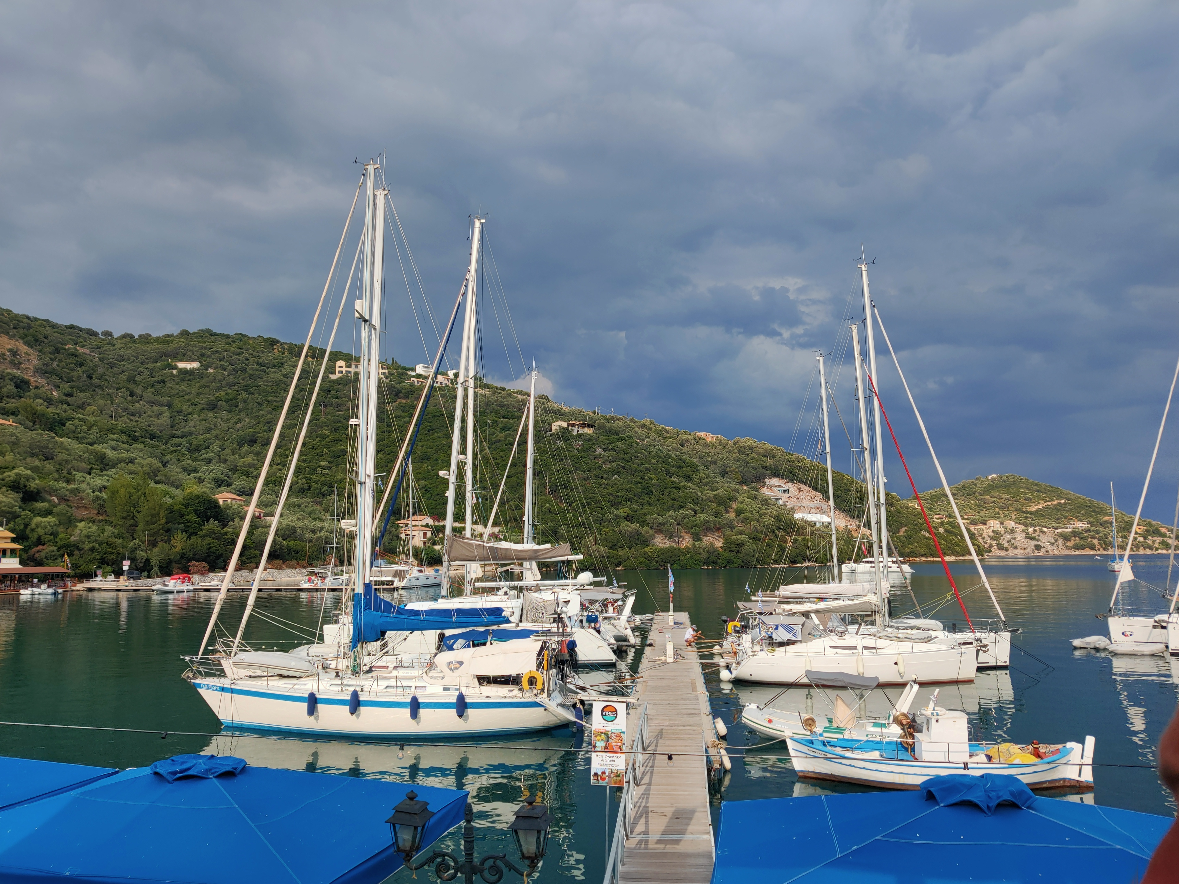 With the partial lifting of internal EU travels restrictions, over the last week or so the charter fleets are finally leaving the dock and owners are returning to launch their homes. Overnighting in Sivota, in part to fill up with water and gain access to mains electricity to try to track down a potential battery issue, in part to eat out at the friendly Stavros Taverna on Monday was a very different experience from our previous visit a couple of weeks ago. The pontoons are in the water, shops and restaurants are fully open and charter flotillas fill many of the berths. Not quite business as usual but getting there. Handwashing or sanitising is expected everywhere, masks are worn by waiting and shop staff, distance is maintained and only six people can sit at a table.