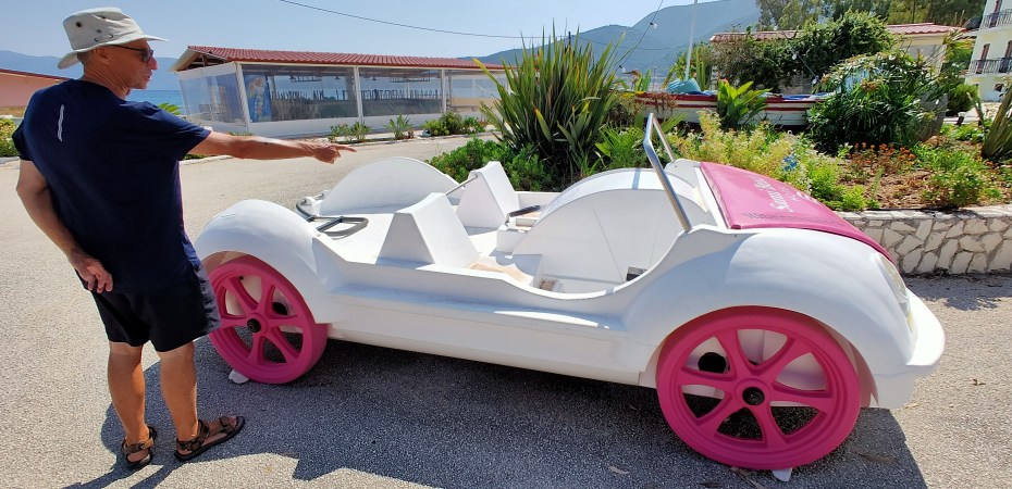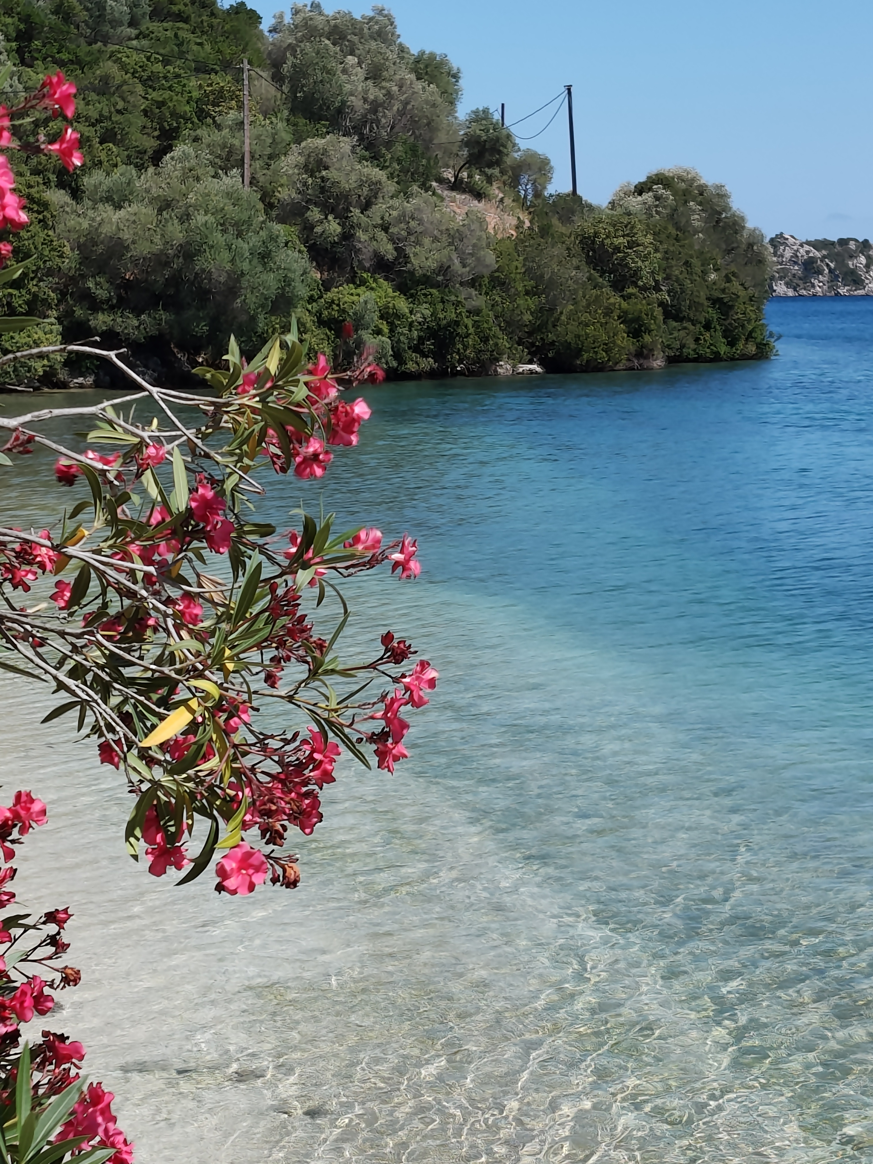From a berth in Sami Harbour, on Kefalonia the four of us walked along the coast to the next village where there is a cave containing a lake across which you can go for a short row. Masks and hand sanitizer are required as is spaced out seating in the boat, the four of us sat around the stern, another couple in the bow, our guide between us. This is the face of tourism now. The price of entry has been reduced by a euro to six! The lake itself is not big, the roof of the cave has collapsed making the place like a Thai hong but with very different vegetation overhanging the cliffs above us. Once the sun gets high enough the crystal clear water became an amazing shade of vibrant blue. We were fascinated to hear that the water reaches the lake from sink holes on the west coast several miles away, taking fourteen days to travel underground to the lake then on to a small pond just below on the east coast where it was once used to power a water mill.