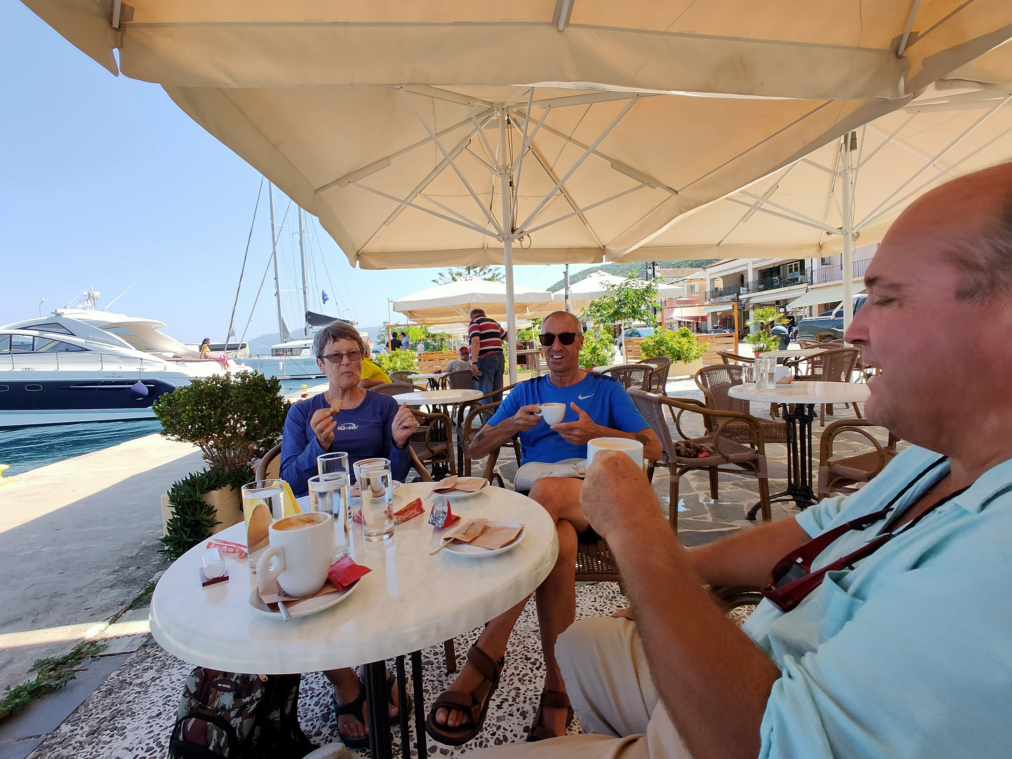 In the first few weeks the weather was cool enough to embark on regular morning walks into the hills surrounding the harbour or bay we were in. Now in July the sun is getting hotter and our morning excursions have mostly been limited to trips to the supermarket or laundry arranged around coffee ashore. However just as we wondered how to keep reasonably fit without our daily walk, the sea has become warm enough to swim in again though snorkelling is not as rewarding as it is in the tropics. The rise in temperatures has also brought a few afternoon thunderstorms together with brief but strong winds and welcome rain to wash the rigging. Our flotilla guide Pat has gently suggested Tranquil or Vliho Bay near Nidri as a refuge from adverse weather on a couple of occasions; anchored there whilst the wind howls elsewhere, we have come to regard it as the Tobermory of the Ionian!