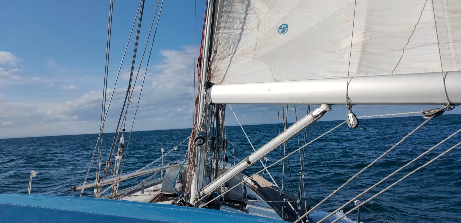 At the watch change it’s decided there isn’t enough breeze to make decent progress so Temptress motors on through the night. By 06:00 we have a little over 80 miles left. Pleasingly the coastline has started to appear on the chart plotter. The morning sky is blue with a scattering of fluffy fair weather cloud. The sea state is choppy, left over from the recent winds, whilst the breeze is mostly what is being generated by our forward motion.