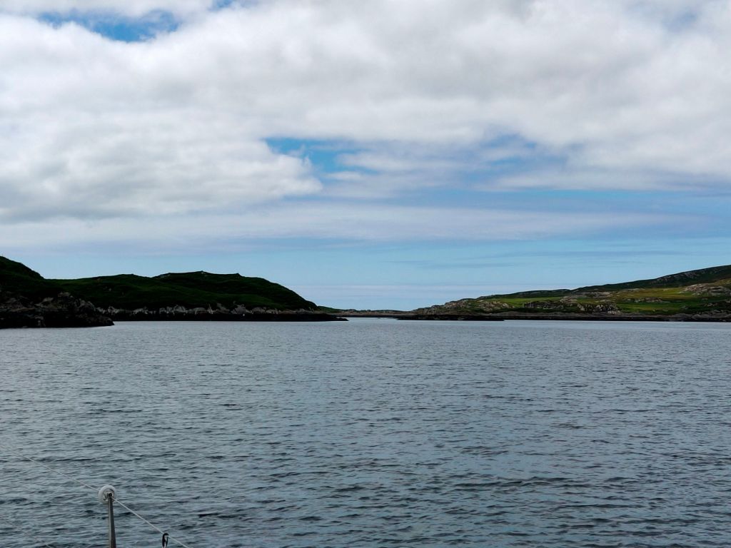 At noon we set off, one of several boats heading in the same direction. If we’d thought yesterday’s trip through Rathlin was a sleigh ride, the Sound of Islay on a spring tide was amazing. Our peak speed was over eleven knots thanks to the tidal assistance. The whisky tour continued as Caol Ila, Ardmore and finally Bunnahabain sped by on our port hand side. To starboard the peaks of south Jura cast off their cloud caps then regained them before finally being persuaded by the sun that they didn’t need hats. Green and granite grey with few trees, the spectacular scenery sped by.