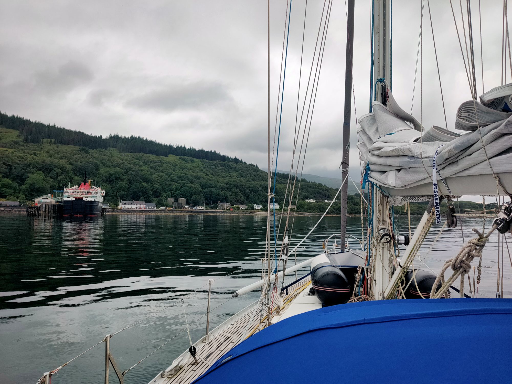 Around the corner into the Sound of Mull we spied a boat pumping up their dinghy on the foredeck. Mainsail still up but doing nothing as there was no breeze at all a back eddy in Duart Bay taking them towards the corner. Wonder if they’ve engine problems? The skipper tried to raise them on the VHF but in the end we decided it was easier to turn around and motor back to them. The four crew of the thirty odd foot Bavaria were pleased to see us. Their skipper obviously knew the area better than us as he suggested a tow just up to the moorings off Craignure, we had envisaged Tobermory. It was text book stuff, their line tied around a bridle hung off our stern cleats. We brought them alongside the mooring and once they were safely secured to it we dropped one end of the bridle to free them from the tow all under the gaze of the ferry passengers watching from the decks of the Calmac. Hope there’s more to Craignure than the Spar and the roro terminal, though Oban is just a short ferry ride away for spares.