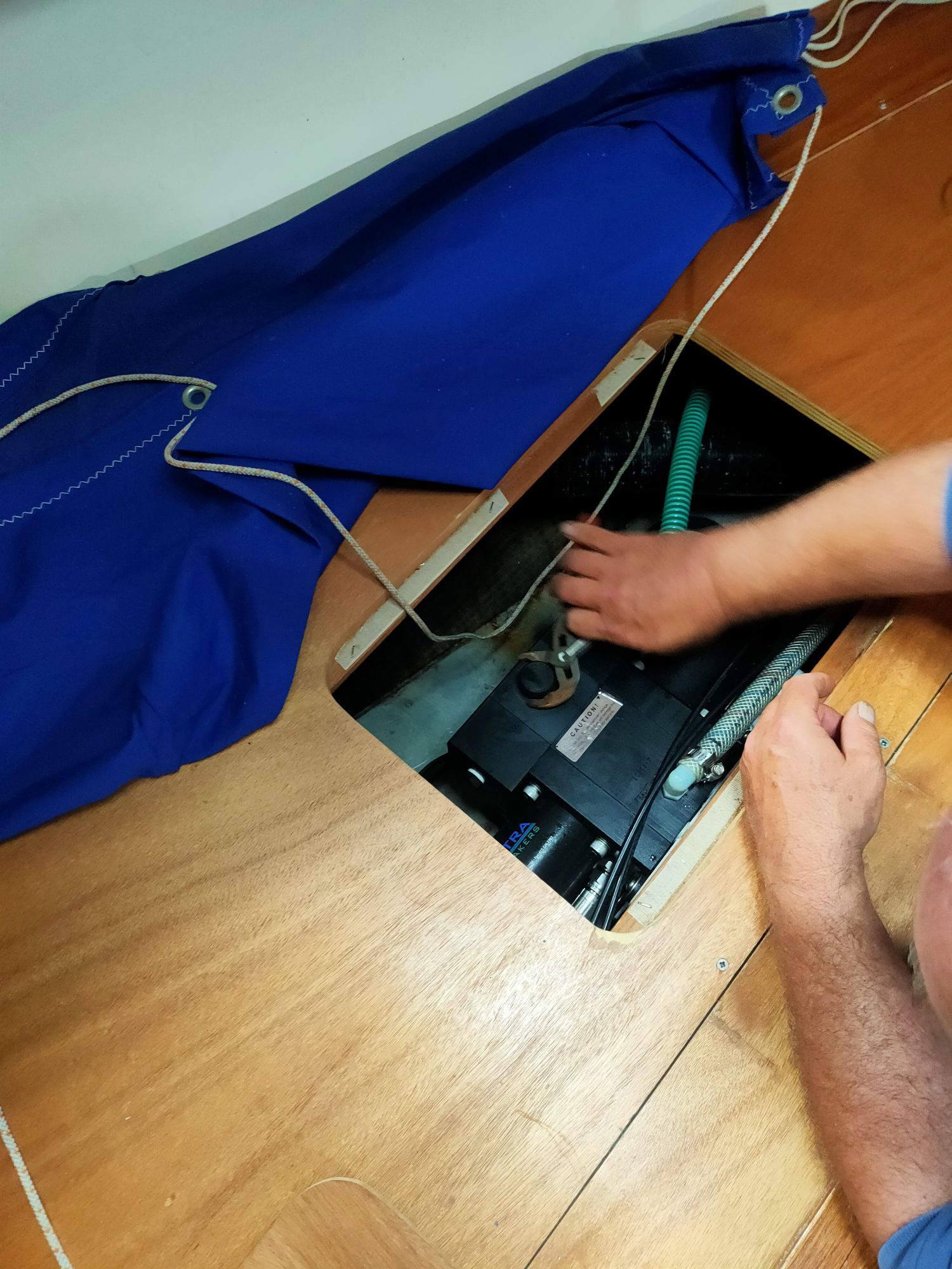 Having repacked the forepeak it was time to strip our bunk of everything including the mattress and boards below. The whole lot was piled in the saloon blocking the passage. I passed tools over as requested. The fitting was extracted and dipped in hot water to soften the old hose so it could be removed. Then the new hose was threaded through from the heads under my Tshirt locker and into the space behind our under-bunk drawers where the watermaker lives. It connected up relatively easily and after many months our watermaker has a fully functioning outlet for the waste brine once more. Kevin then spent sometime trying to get the rest of the system working again, then just left it running. The harbour is relatively clean and we are plugged into the 240v supply. Eventually sweet non-chlorined water was produced, the first time for several years and in quantities not seen since we were in the Pacific.