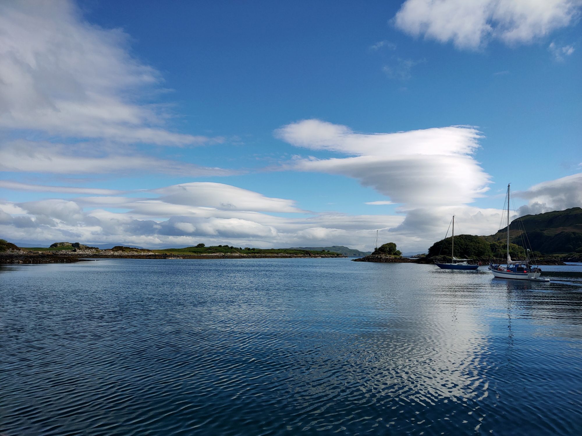 Sometime in the dark the skipper heard a boat come in, it didn’t disturb my slumber one jot. It was anchored very close off our stern but the wind has gone completely for the first time since we left Bangor. The water was mirror smooth. Slowly most of the boats departed. Our very near neighbour among them. He explained before he raised his anchor that most of the boats were either charter boats on their way back to base on a Friday night or on their first night out of Oban on a Saturday night. The rest of the week the place is quiet.